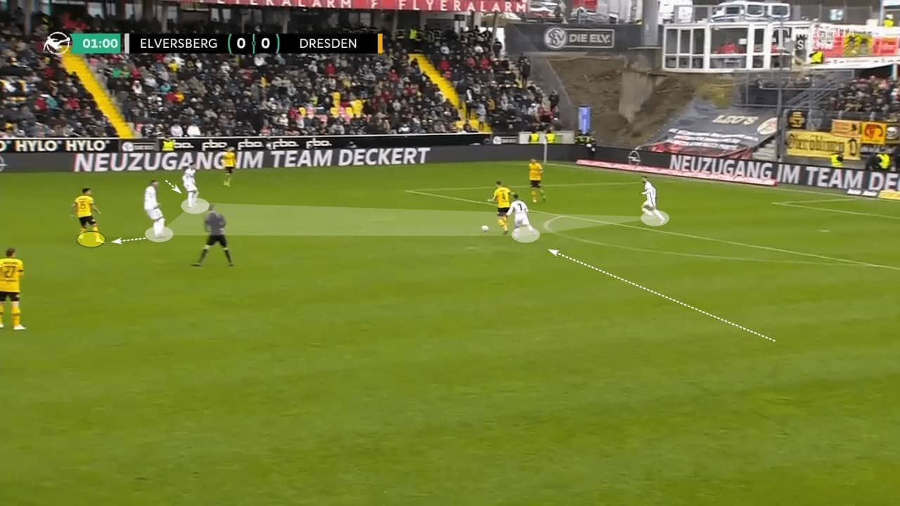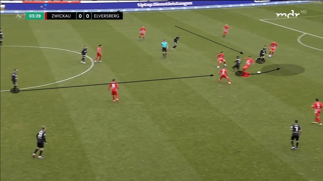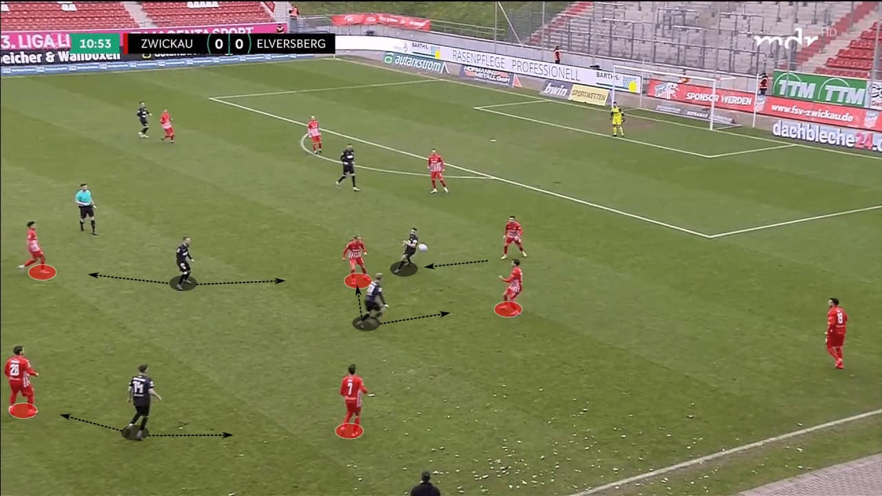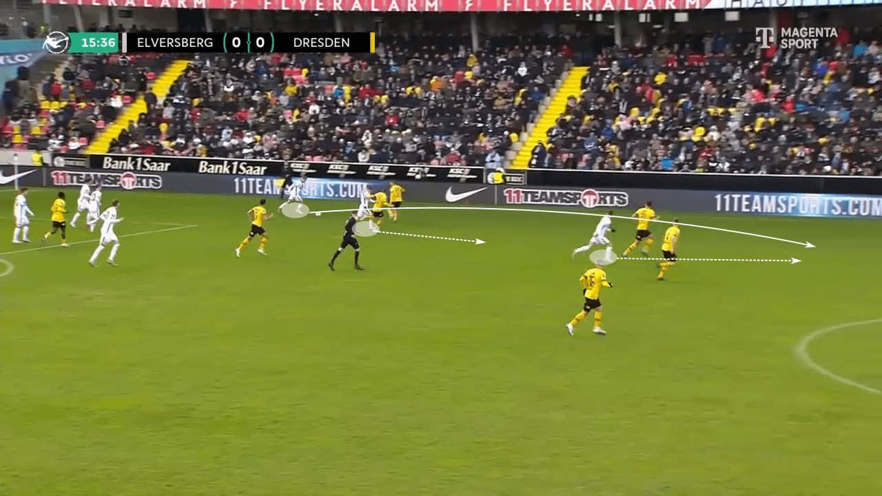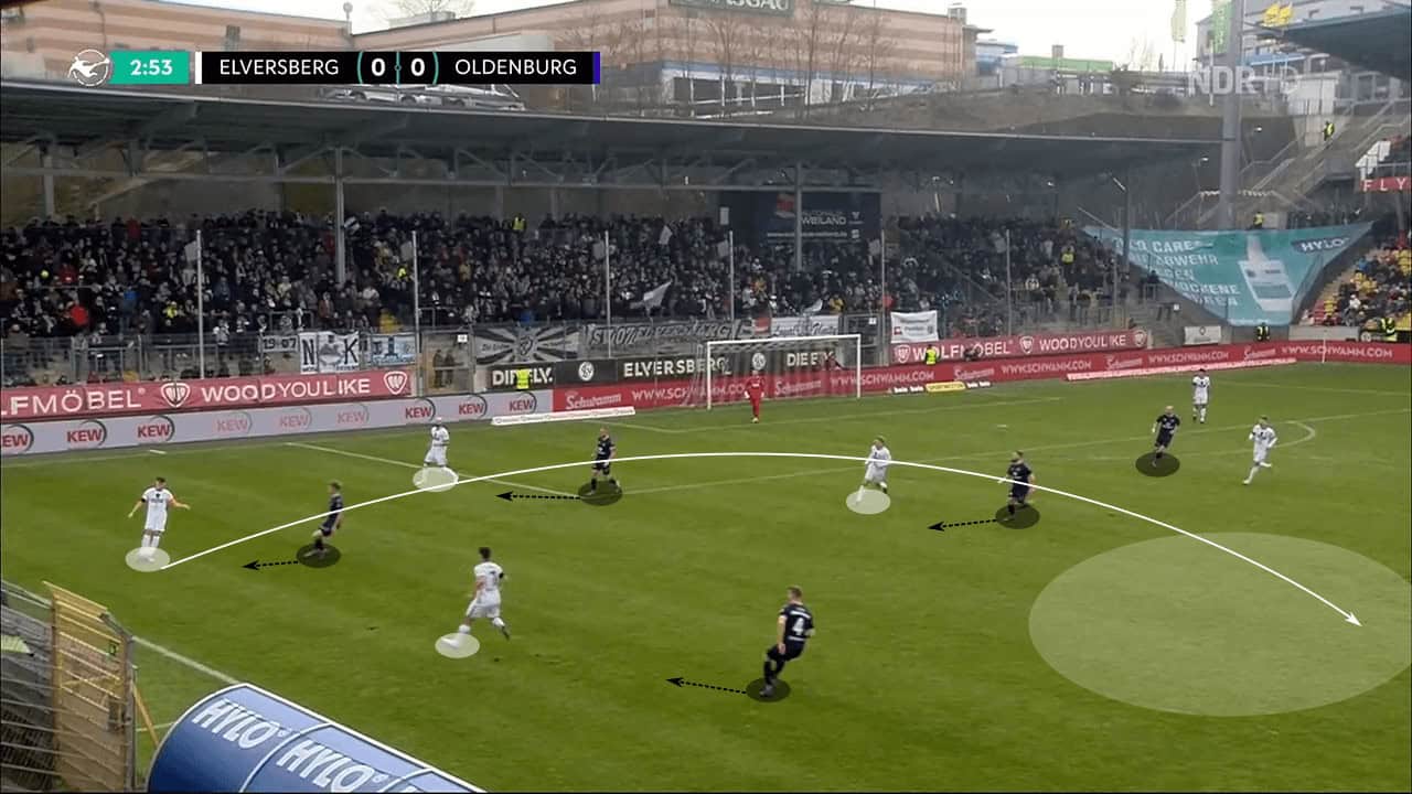In the image below, as Elversberg attack on the left wing, Feil, the right midfielder, moves all the way across to provide support.