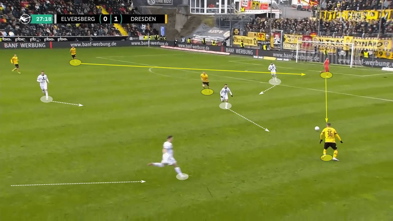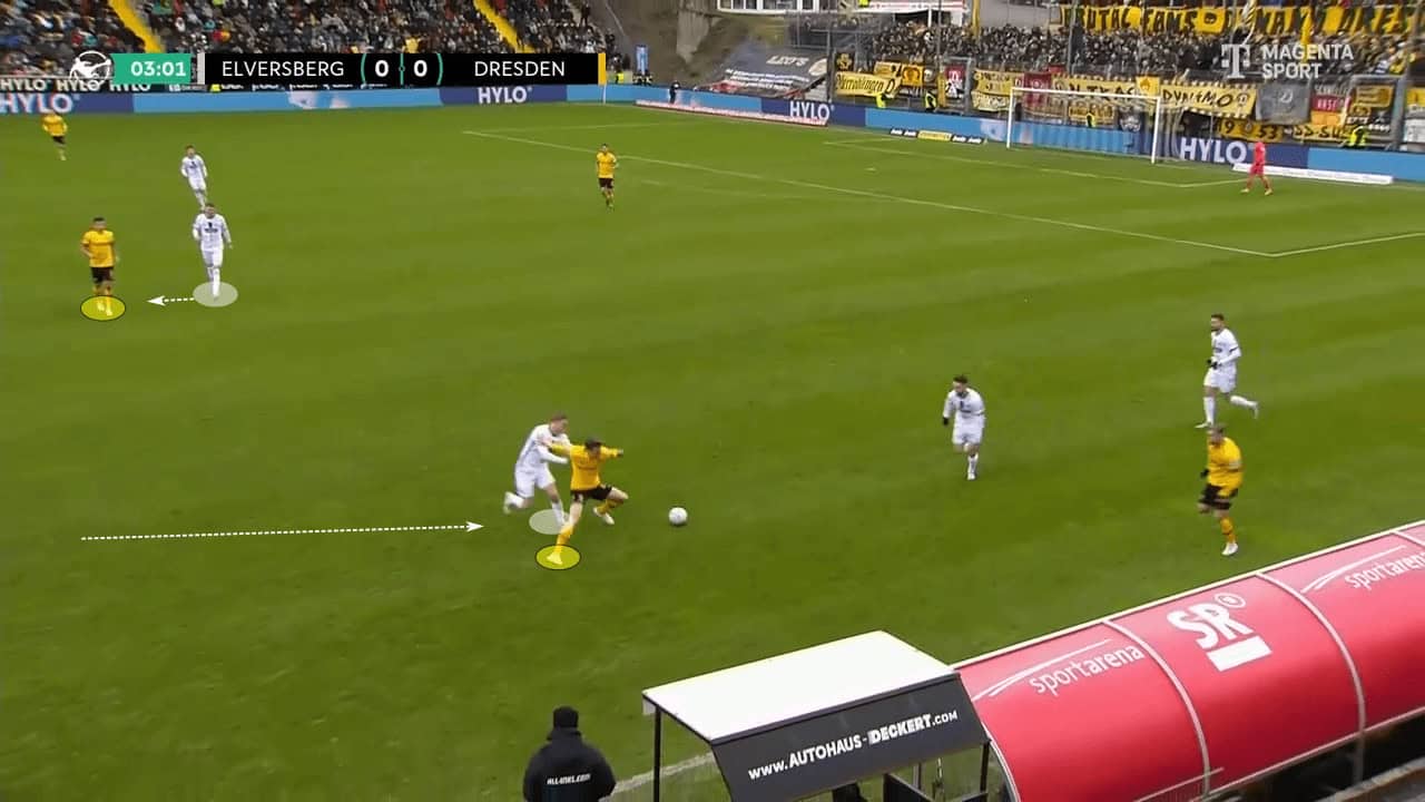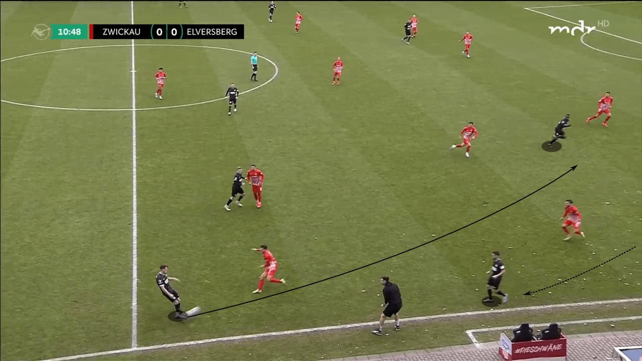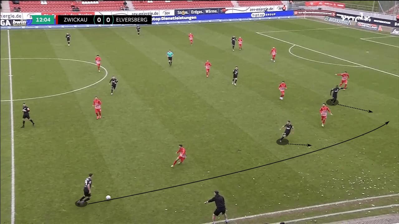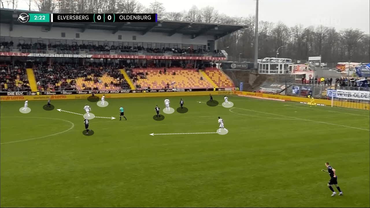 In the image below, as Elversberg attack on the left wing, Feil, the right midfielder, moves all the way across to provide support.