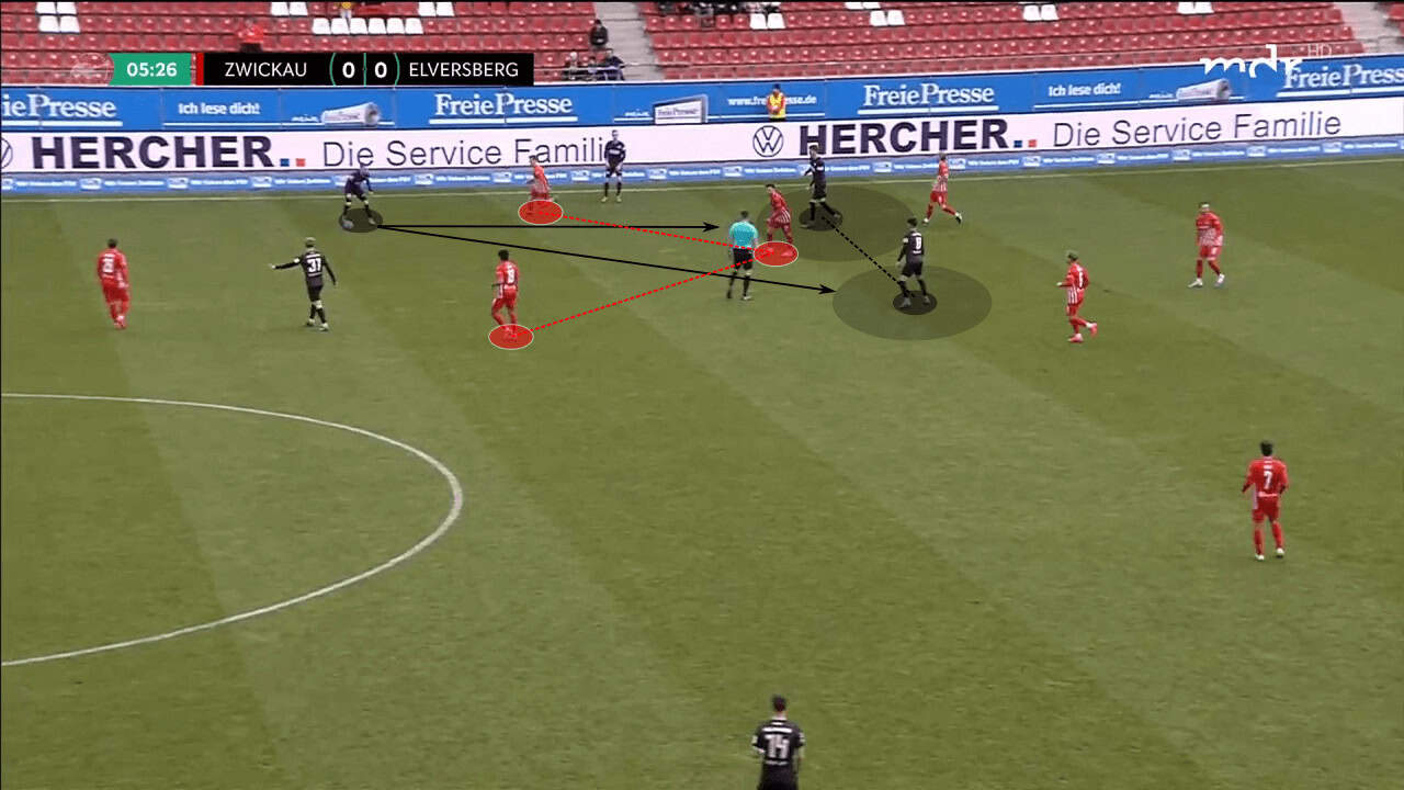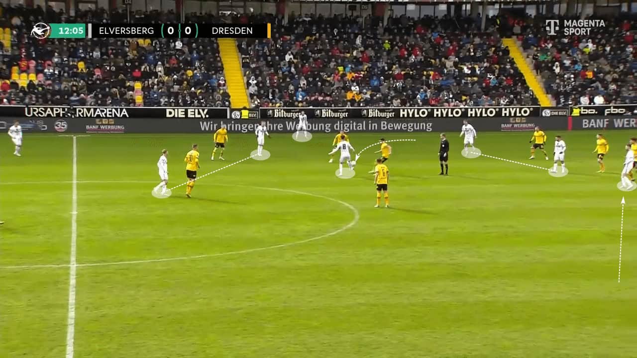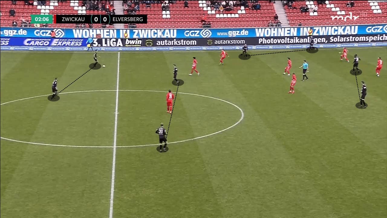 After the opposition plays to one side, Elversberg’s far midfielder shifts all the way inside to box the opposition in, while the centre-forward keeps man-marking the first midfielder.