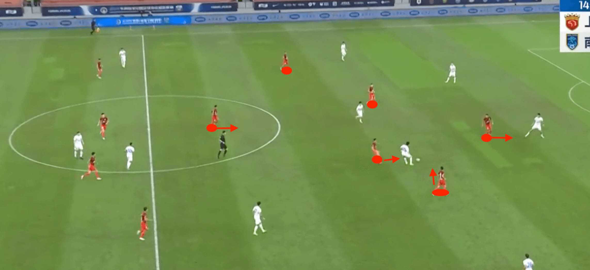 With the presence of wingers looking to directly press the ball carrier or their closest passing option along the flank, opposing teams often resort to clearing the ball from danger and allowing Shanghai Port to force the turnover.