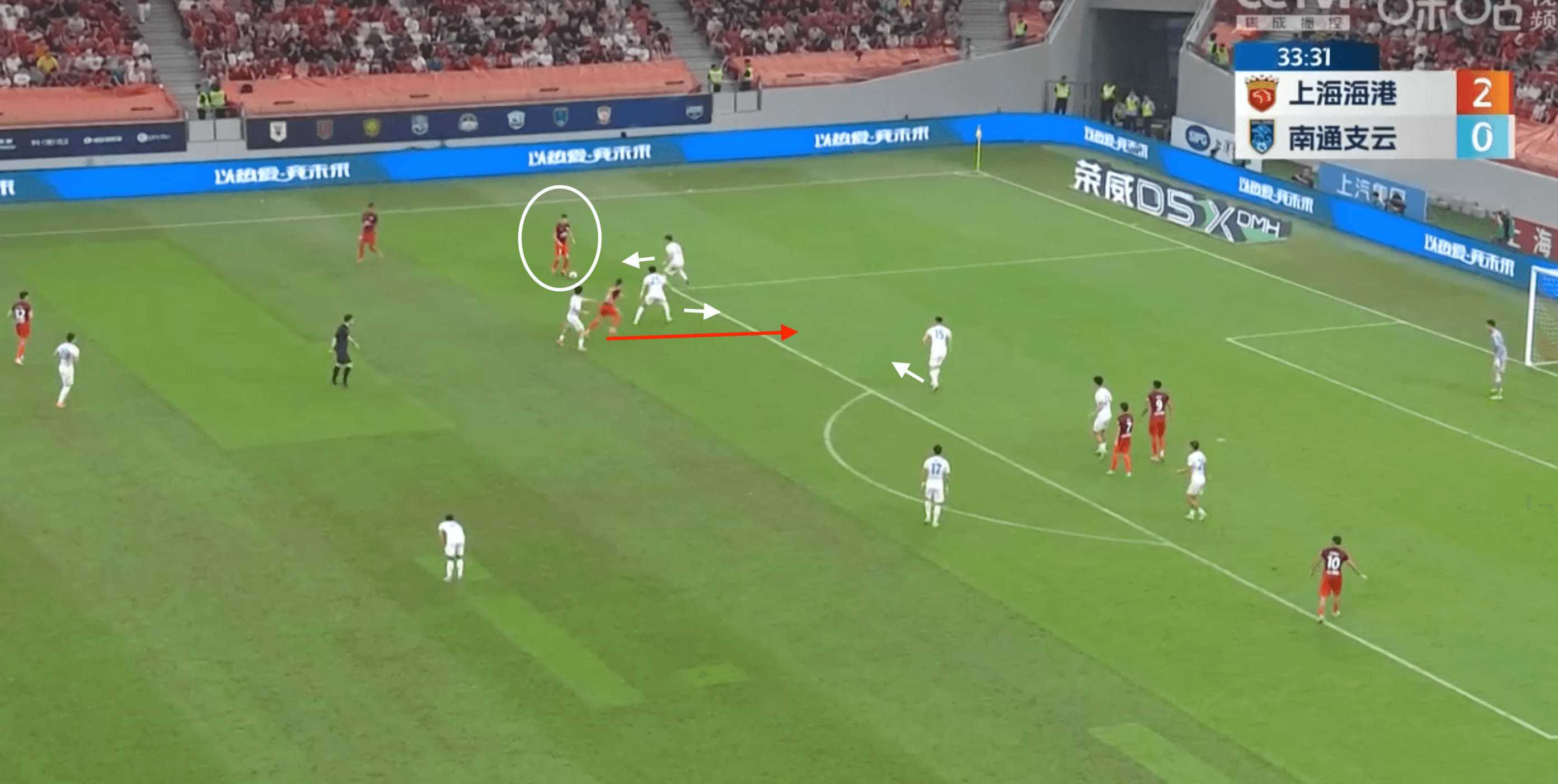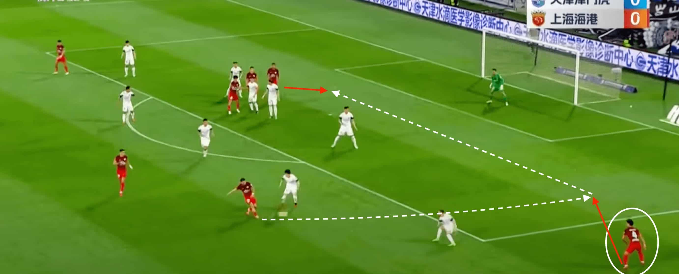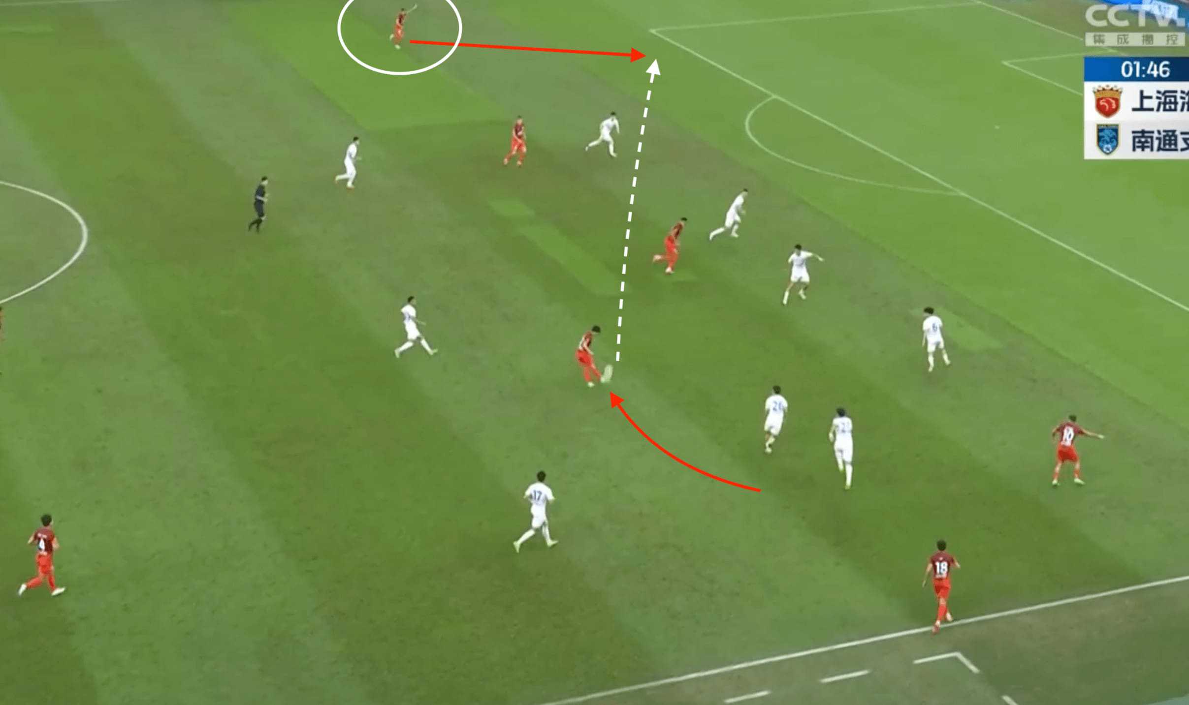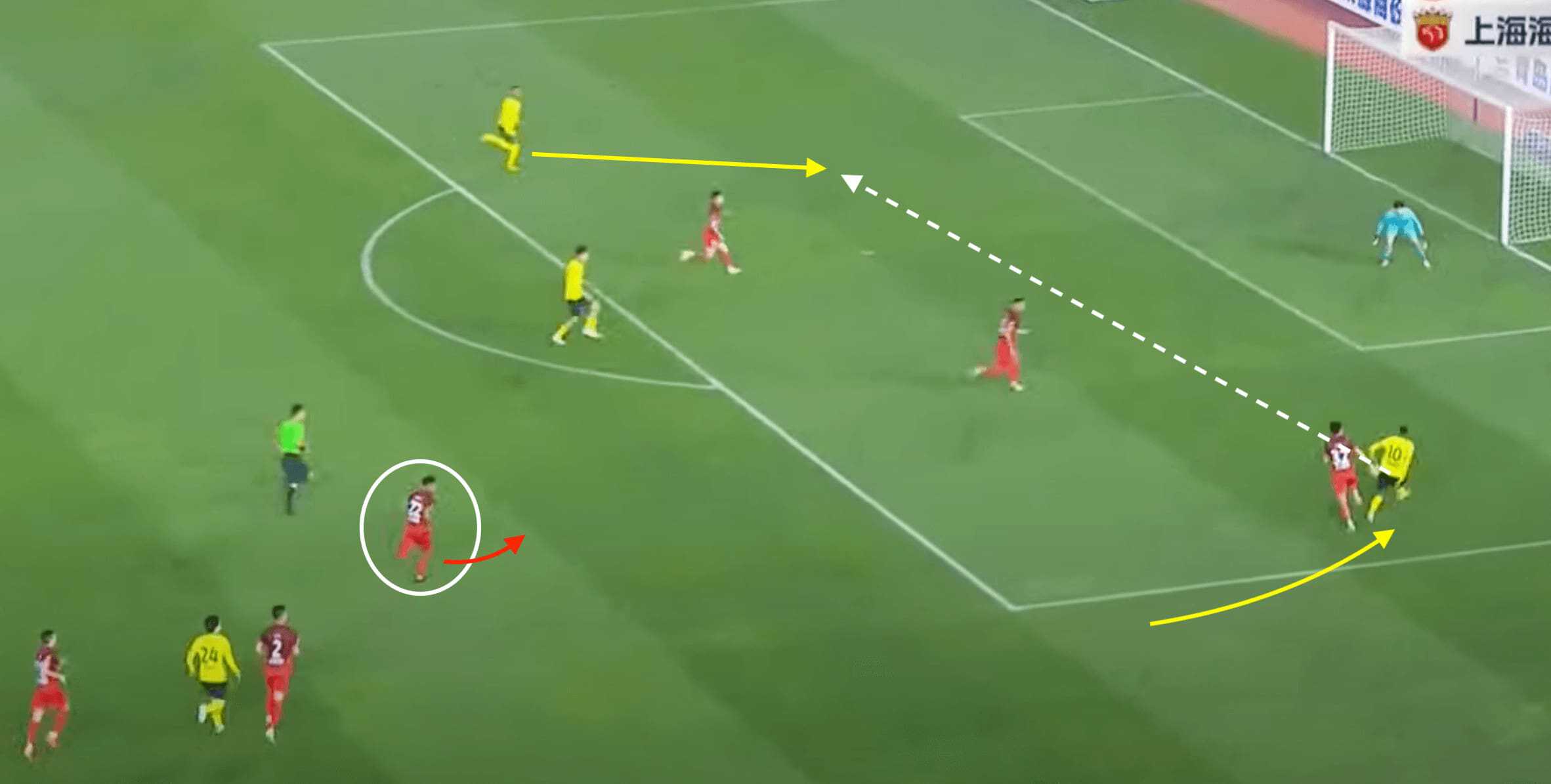 In their victory against Tianjin Jinmen, we see Shanghai Port recycling an attacking opportunity before sliding the ball in behind to meet the penetrative run of Wang.