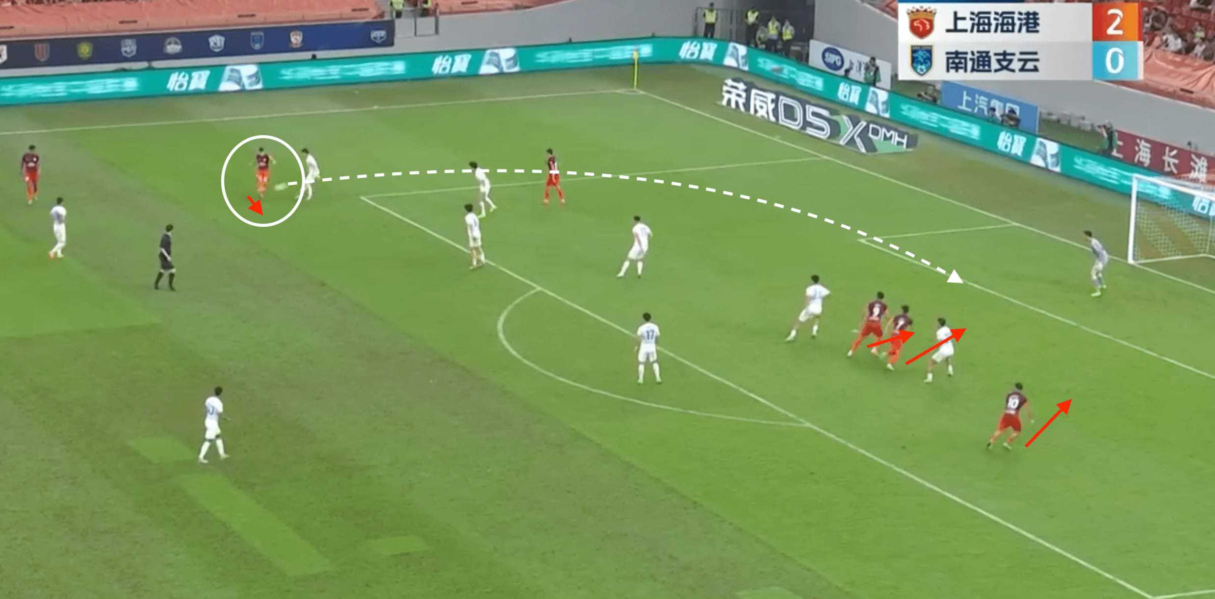 Shanghai Port’s crossing has excellent variation, as they have additionally targeted floated switches to the back post, targeting potential runners who can provide an opportunity on goal or another pass across the goal.