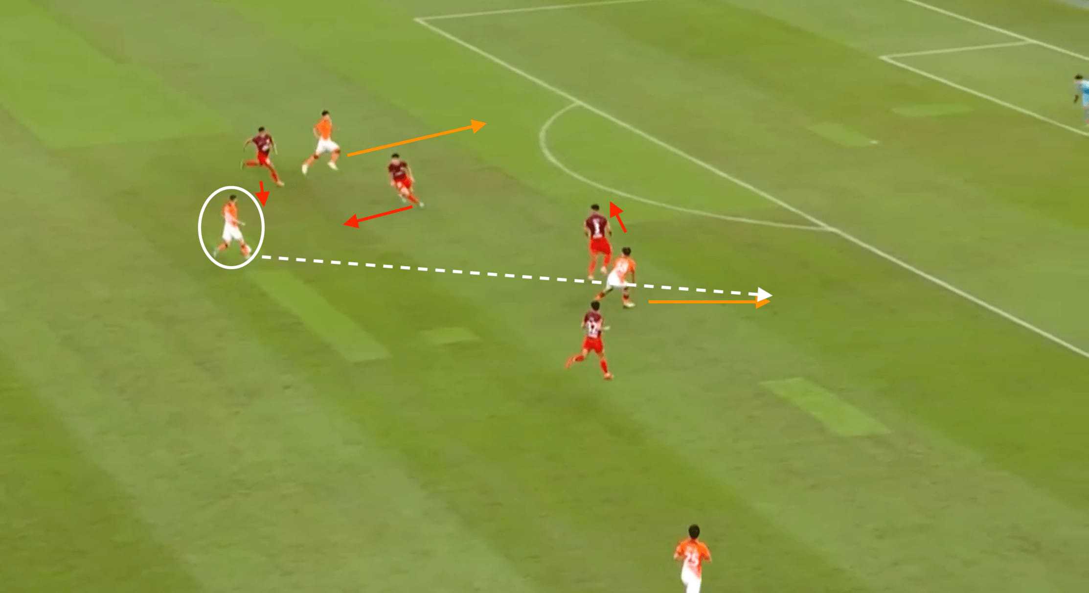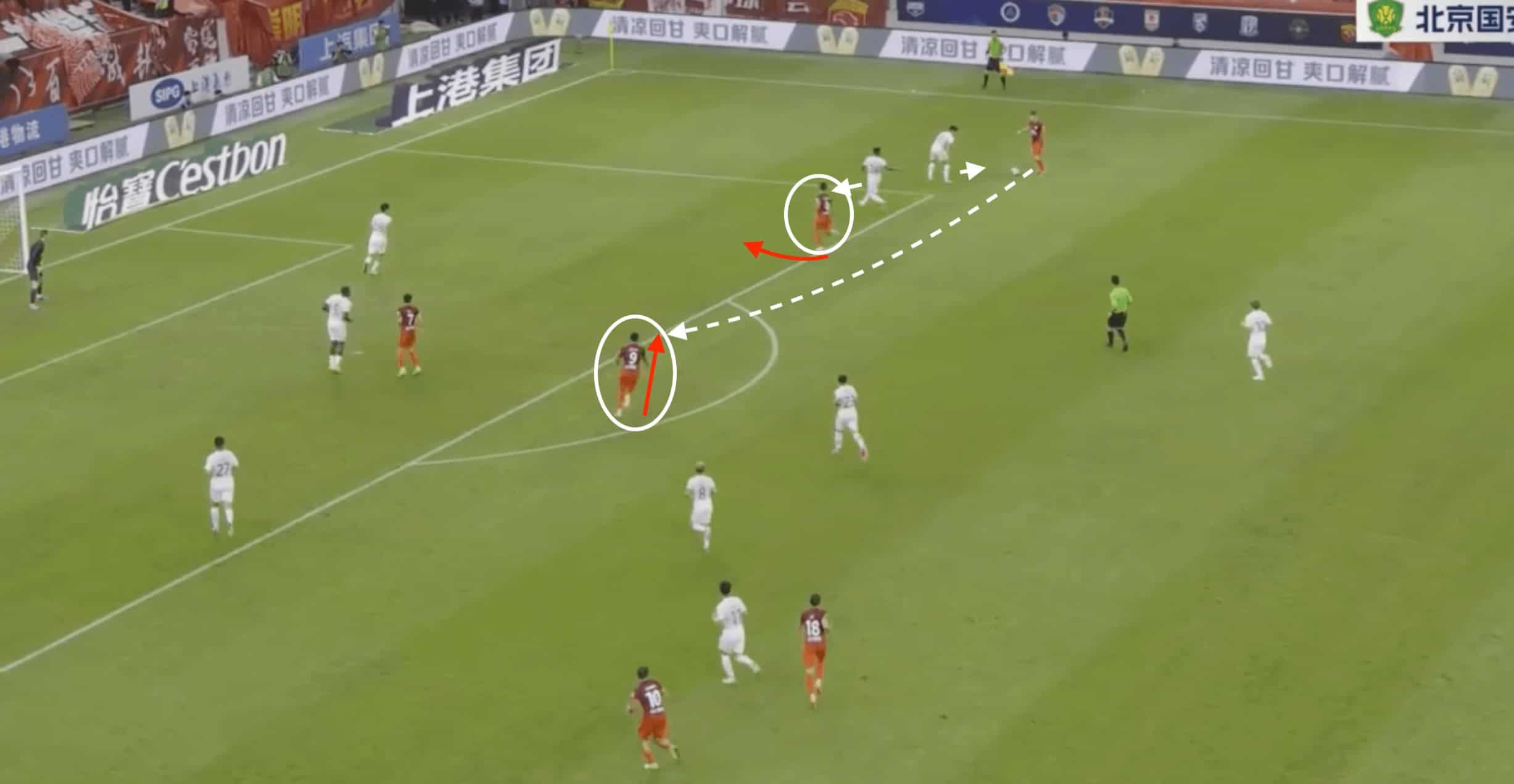 In their match against Beijing Guoan, Wang’s underlapping movement forces the Beijing defender to track his run into the penalty area, opening up a critical passing lane into the feet of Gustavo, with the Brazilian able to touch and fire towards goal.