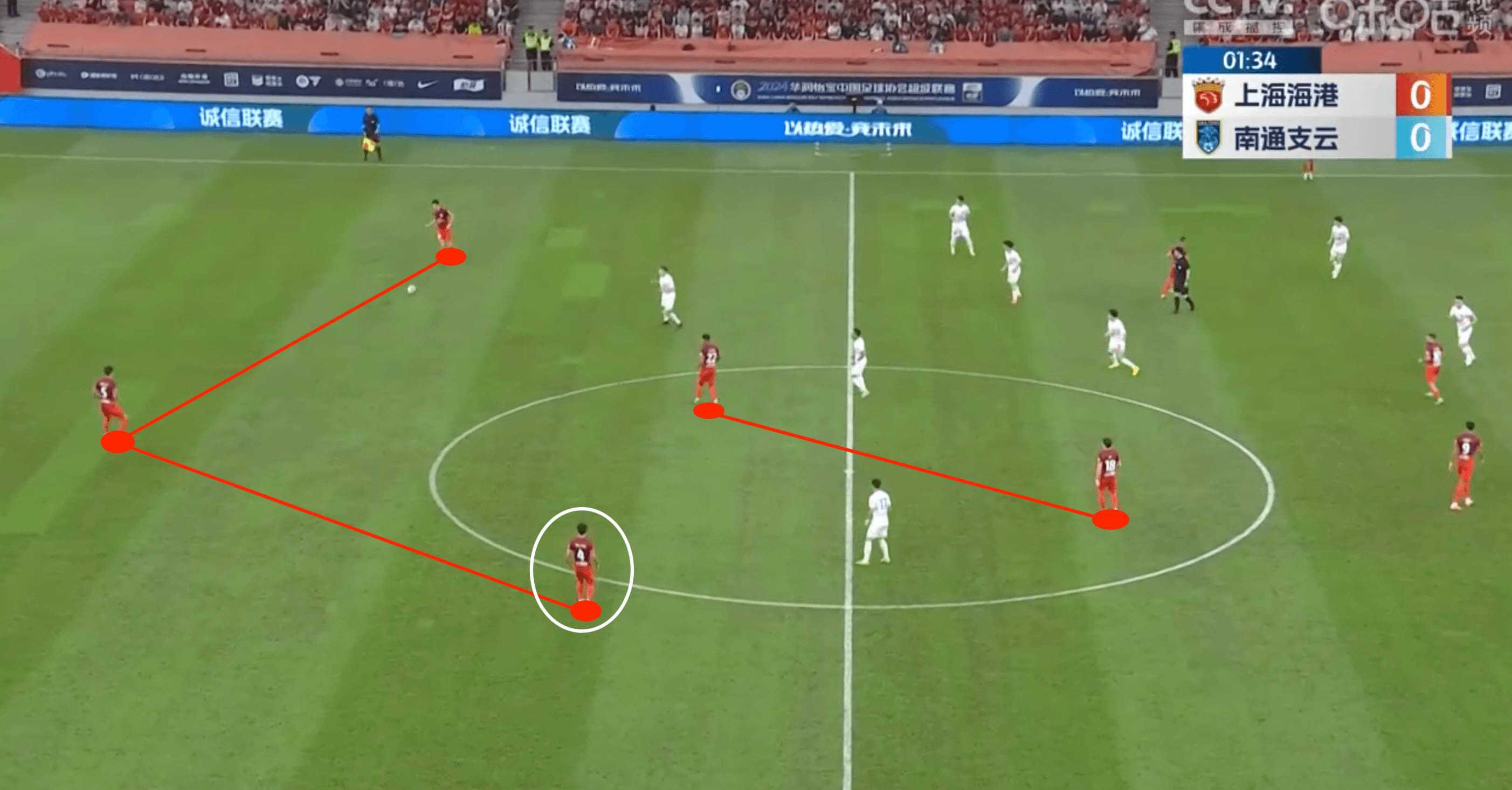 This man-oriented press often has a 4-2-4 structure, with Shanghai Port’s wingers advancing up the pitch as Oscar looks to support Gustavo along the forward line.