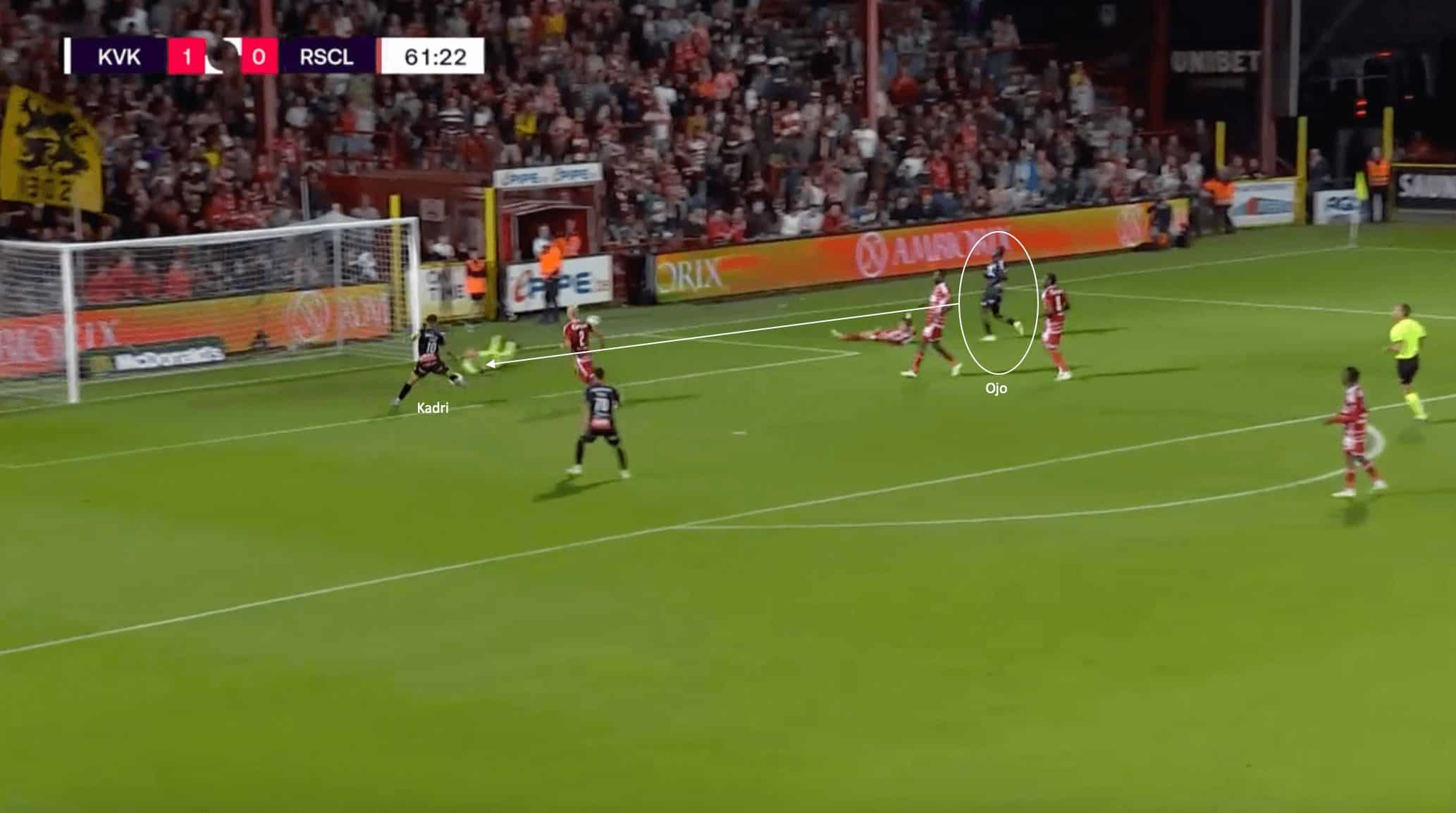 This example above shows another opportunity that Kortrijk had a bit later in the match to seal proceedings and walk away with their first win of the season. In this phase of play above, Ojo does well to beat the defender and make space to get a shot off at a relatively tight angle. At the same time, Kadri does well to make a run into the six-yard box in case the goalkeeper spills it, which he does.