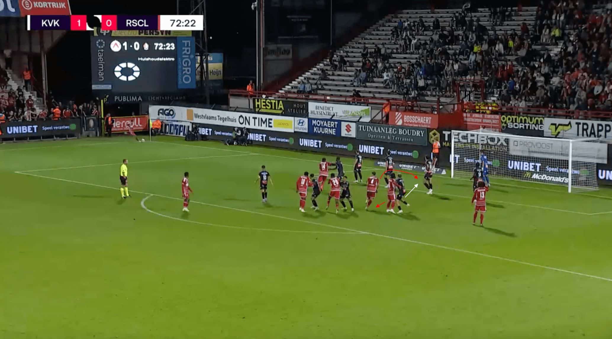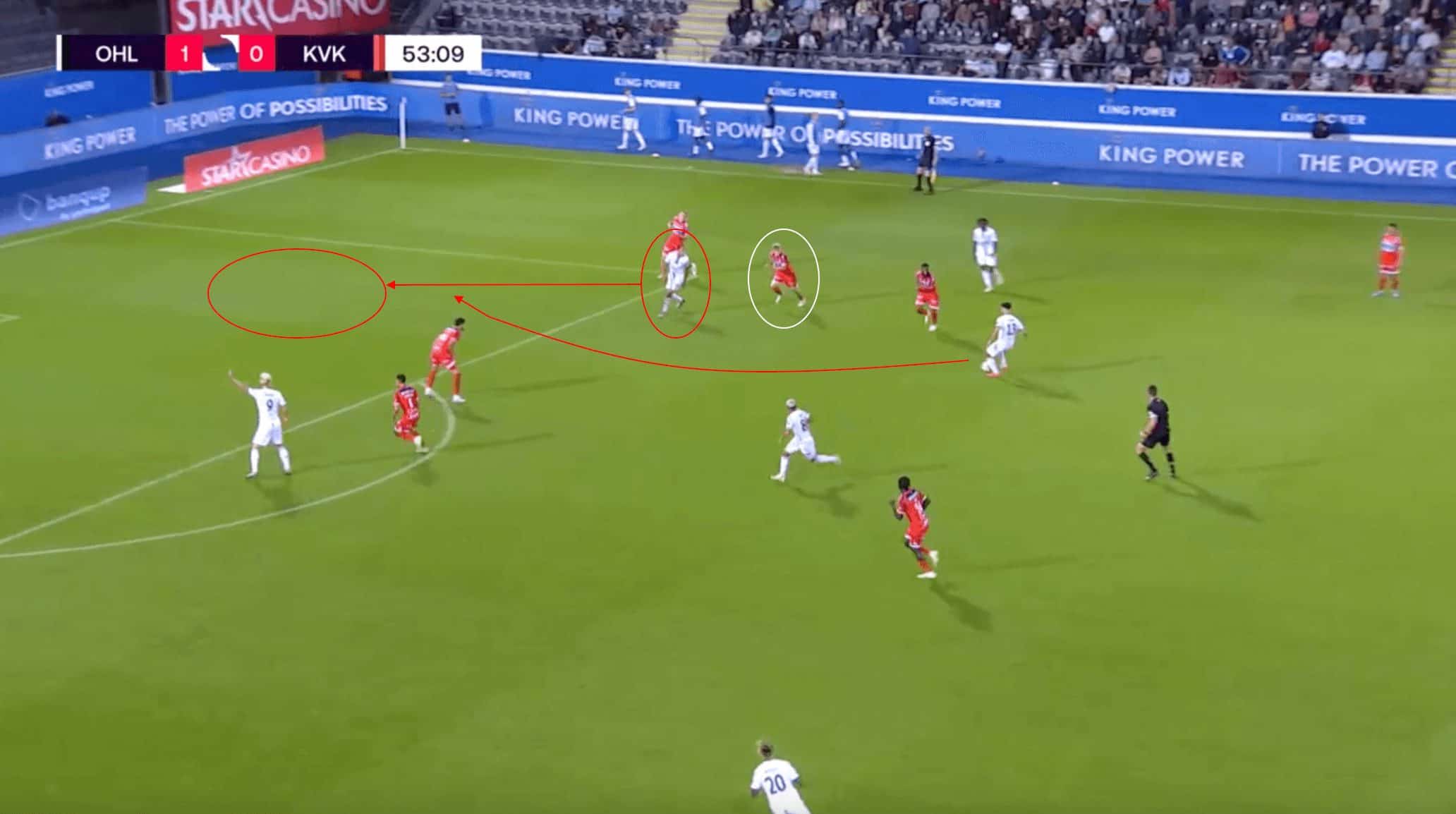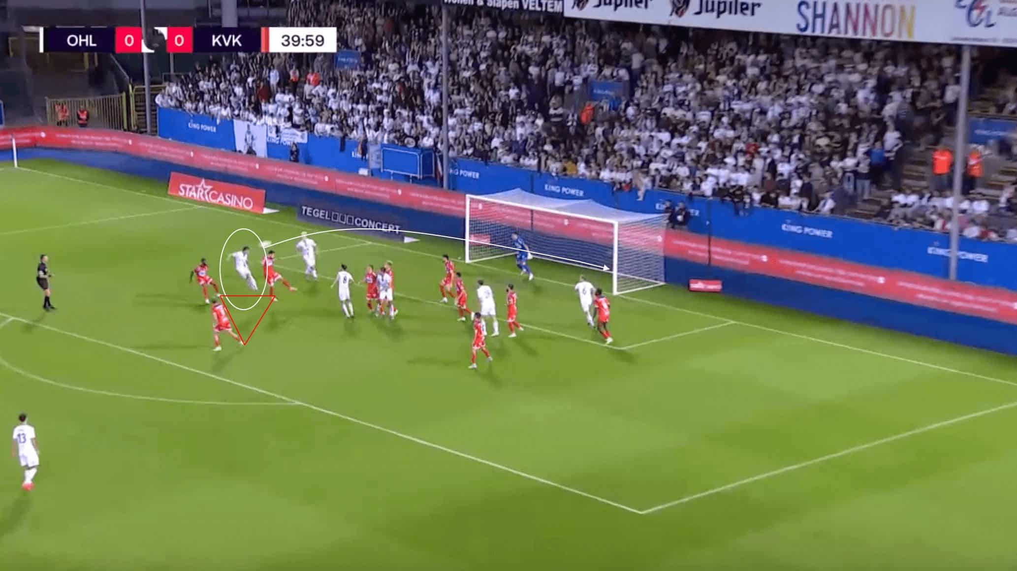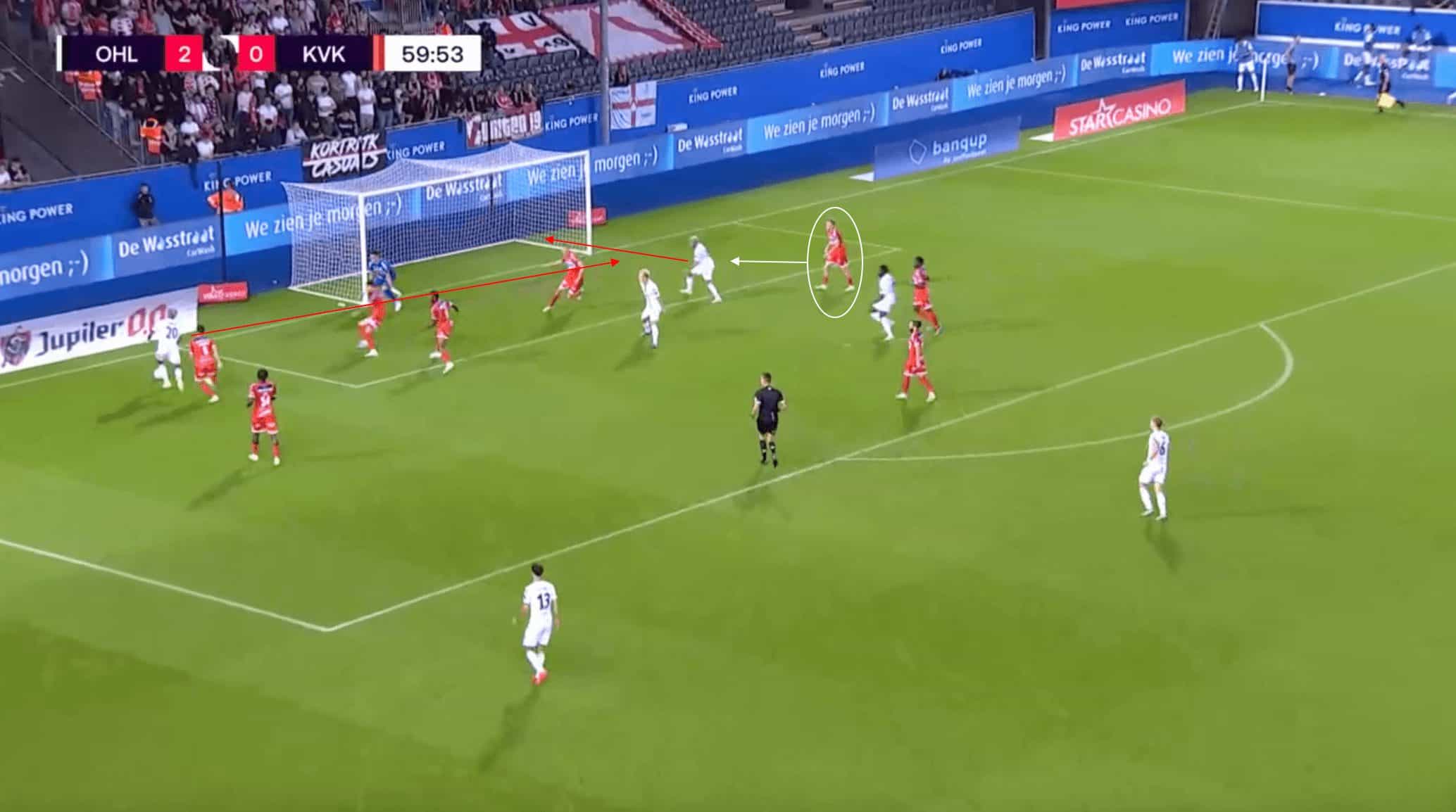 However, the Belgian defender is slow to get back into his position, with none of the other defenders in a position to cover for him due to their stretched central positioning. This allows the Leuven player to get behind the Kortrijk defence unmarked, with the ensuing pass playing into the space behind for him to run onto. His ensuing shot goes past the goalkeeper and into the back of the net, putting Kortrijk in a position that they were unable to come back from.
