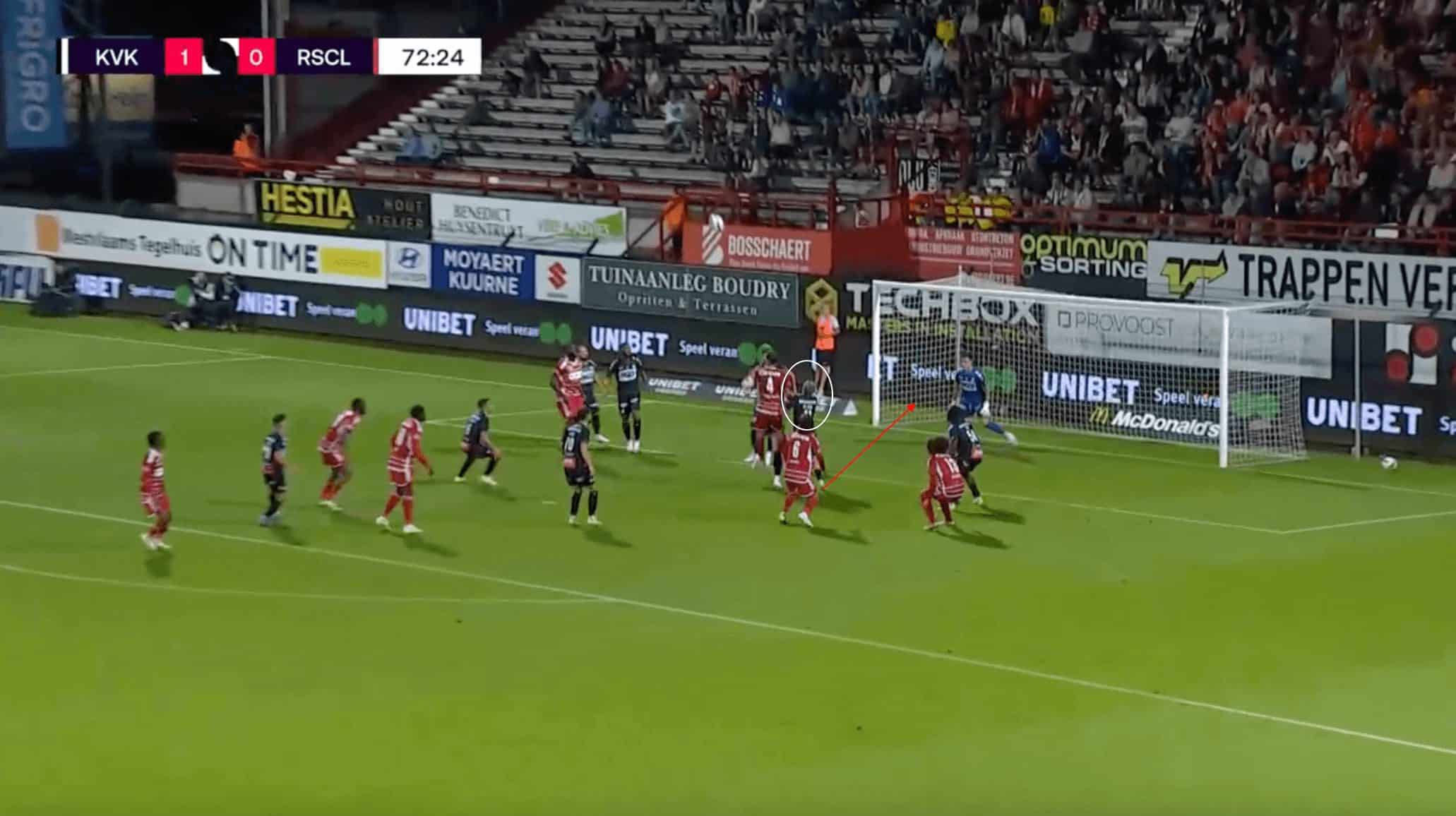 As we can see from the image, the three Kortrijk defenders around the player are not close enough to put him off his jump or put him under enough pressure to divert his header away from goal. The player in front is not close enough to win the header in front of the player, while the defender on his back is not close enough to put any pressure on him. The third player is the one who was caught ball-watching, and if he was in a better position, he could have likely positively impacted this corner for Kortrijk.