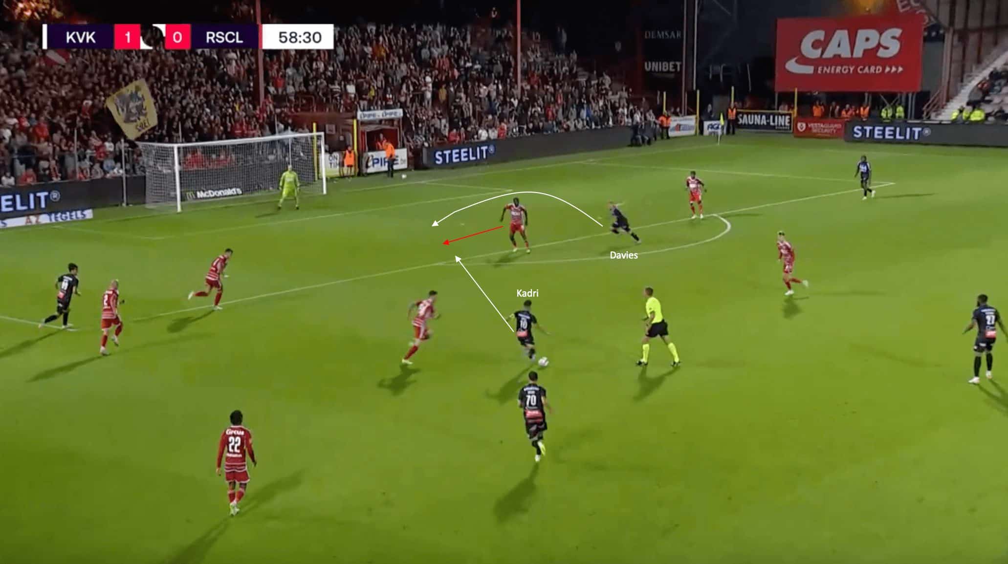 The image above shows an example of this quality in the final third that has sometimes evaded Kortrijk this season. In this phase of play above from their match against Standard, this example shows a prime opportunity for them to put the match out of reach. Club captain Abdelkahar Kadri is in possession in space, with forward Isaak Davies looking to make a run beyond the central defender and into the space.