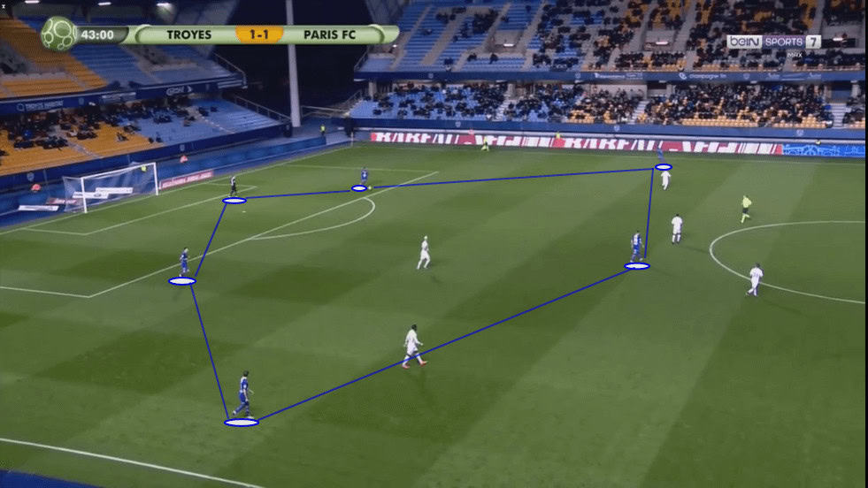 The image above provides us with an example of Troyes’ shape out of possession. Just prior to this image being taken, their opponents had attempted to build out from the back, however, they were forced to play the ball back to their goalkeeper as they struggled to build past Troyes’ first line of defence.