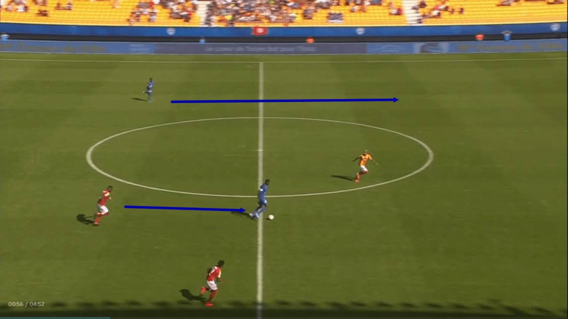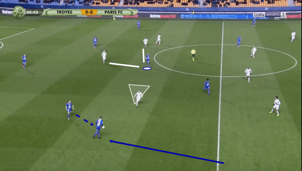 As the centre-backs receive the ball in these wide positions, the role of Troyes’ holding midfielder becomes important, as he has to create a passing angle for these centre-backs to utilise in order to advance play into the midfield. The holding midfielder’s off the ball movement is crucial in these situations.