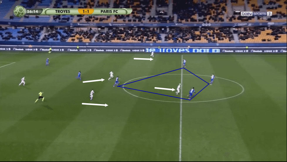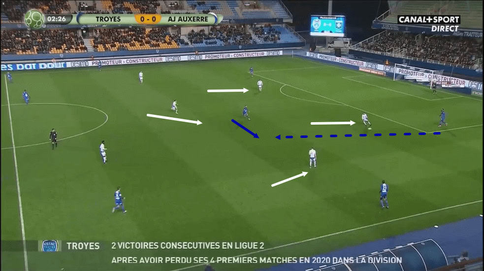 We can see a small example of this in the image above. Just prior to this image being taken, the opposition had built up as far as the middle of the pitch, however, Troyes’ compact shape has congested the centre of the pitch, making it difficult for them to build through the midfield. Troyes’ right central midfielder then broke free of his position to threaten the opposition via his movement, subsequently forcing them to play the ball backwards.