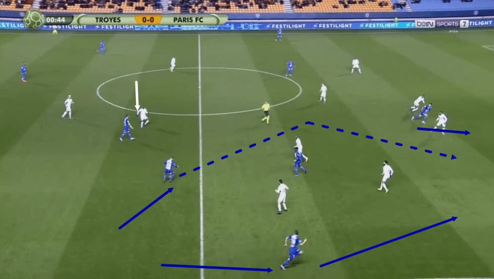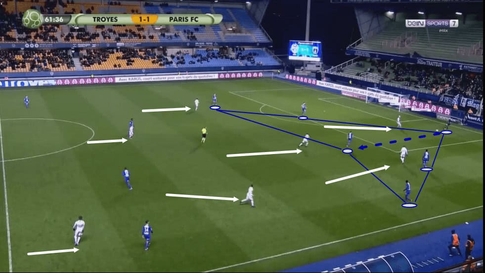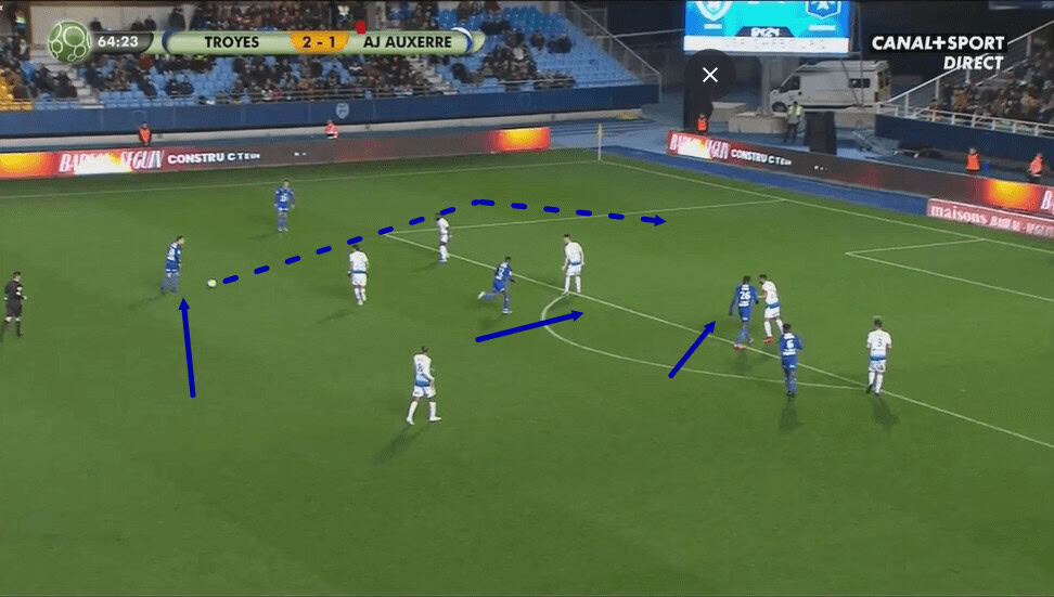 This passage of play provides us with a general idea of Troyes’ aims and patterns in the build-up phase. Once the ball gets into the holding midfielder, they then look to build out onto the wings where they generally like to attack from, when inside the final third.
