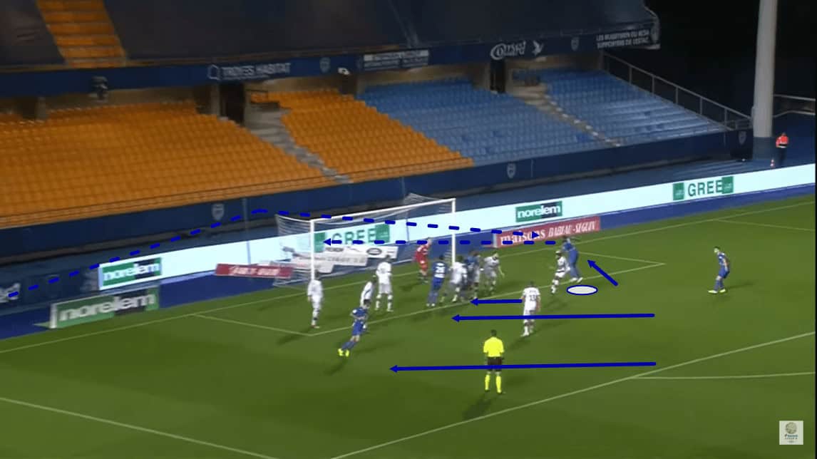 While Barthelmé is a very effective creator in open play, his set-piece delivery is a big part of his game which Battles undoubtedly made a key part of his tactics last term. Barthelmé’s left foot is a dangerous weapon and Battles has taken advantage of it via his set-pieces. Additionally, 192cm tall centre-back Boubakar Kouyaté was used effectively from set-pieces, such as the one in the image above, as he managed to score a total of five Ligue 2 goals last season, making him Troyes’ top goalscorer despite playing as a defender.