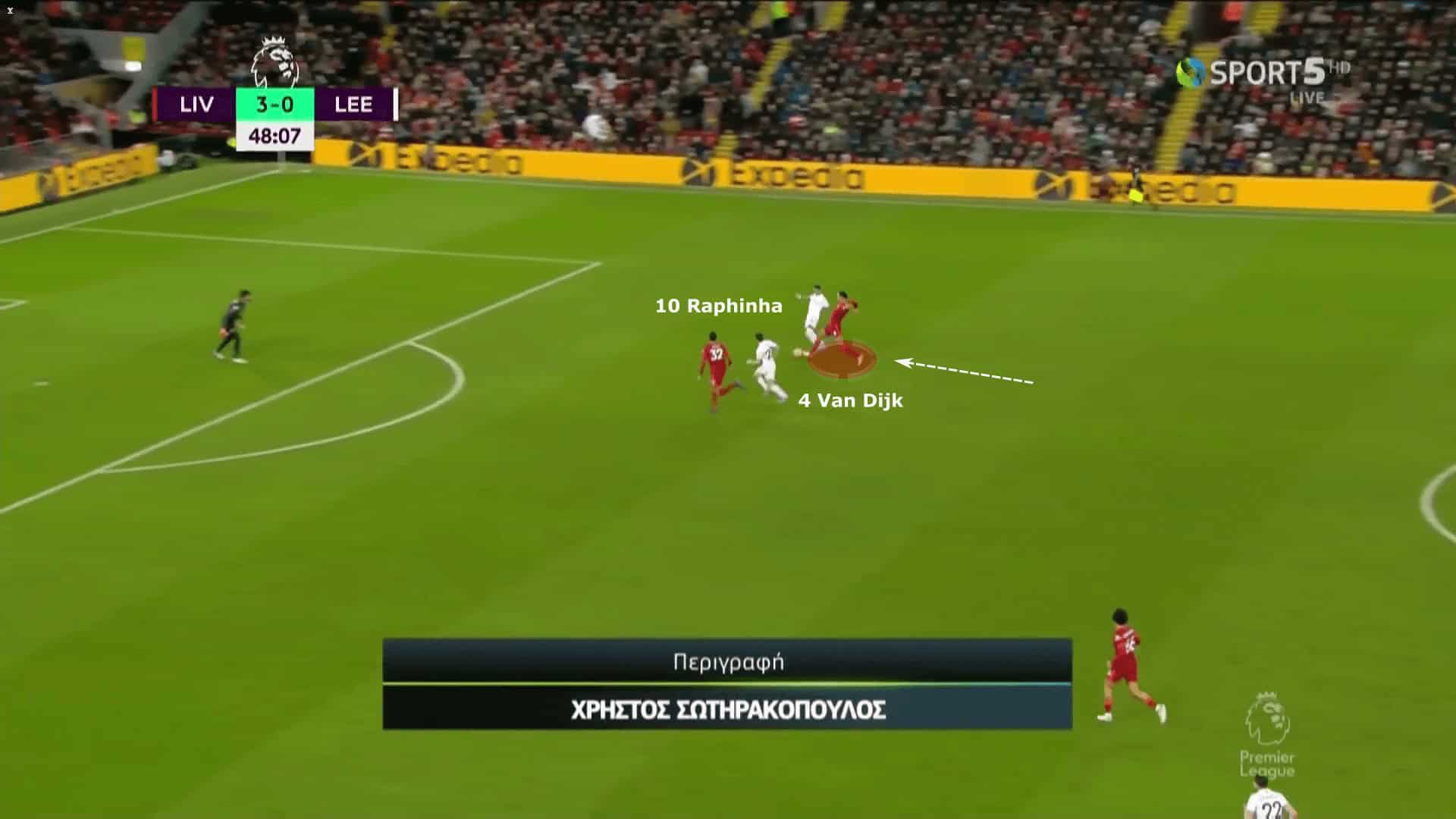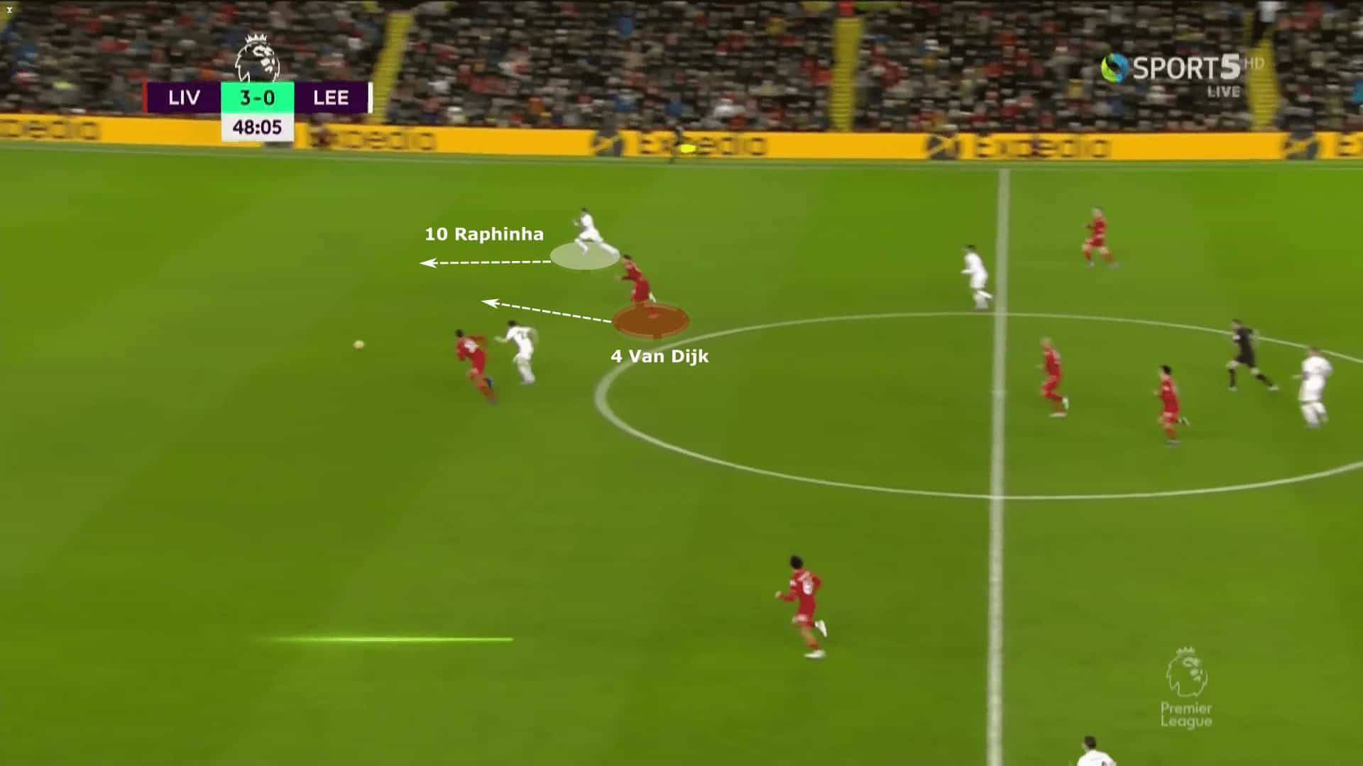 Another example of Van Dijk’s importance in Liverpool’s high line was demonstrated against Leeds United. Dallas is in possession and pings a steep ball in between the central defenders towards Raphinha. The home side are cut open and Raphinha thinks he’s through on goal.