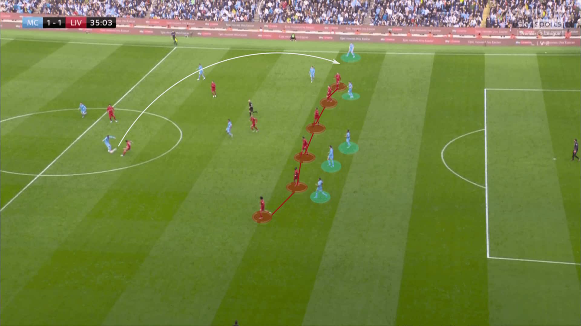 The image below is from the league game at the Etihad, the ball comes out to Walker on the halfway marker after a City freekick. The Liverpool players all push up immediately leaving all the Man City players (5) in an offside position as Walker crosses the ball to the left wing.