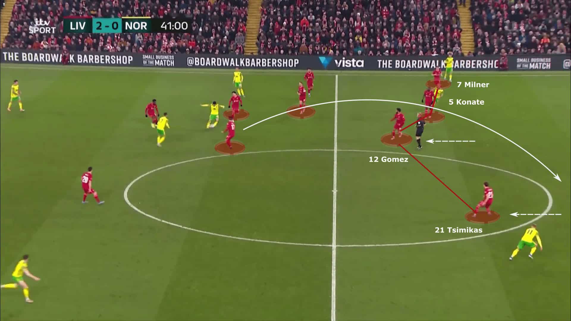 In this example, Liverpool are playing Norwich in the FA Cup with a second-string defense. Norwich win the ball back and the Liverpool midfielders try to counter-press. The Reds are playing with a back four of Milner, Konate, Gomez and Tsimikas who are positioned very high up the pitch.