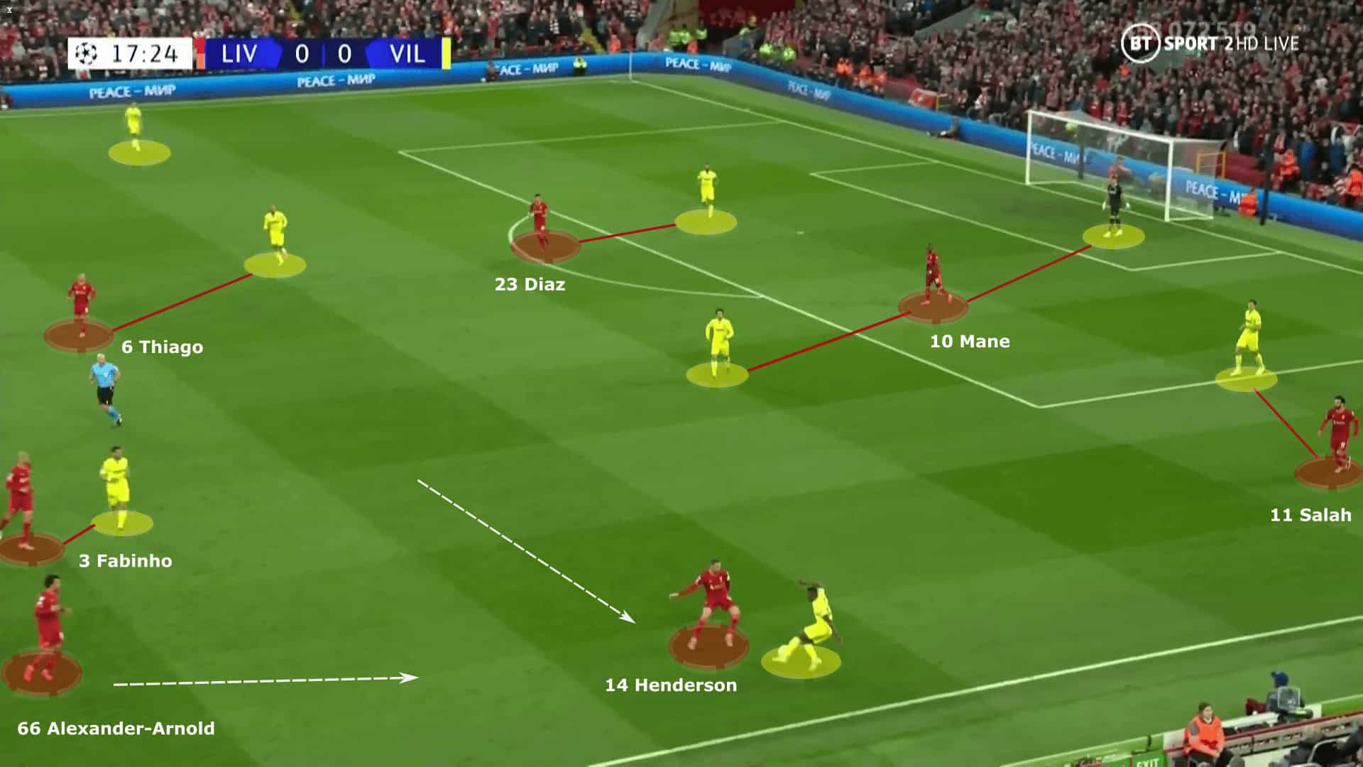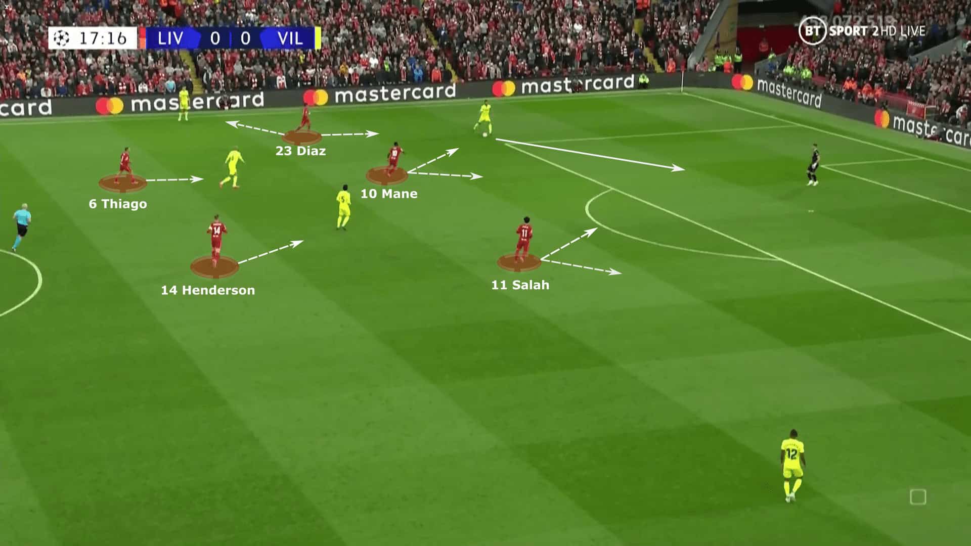 Rulli then feeds it to Pau Torres, and we can see Liverpool’s first block (the front three) are marking five players. Díaz and Salah pressed the centre-backs while Mane covered the goalkeeper and deep pivot. The full-backs were not under immense pressure but Díaz and Salah stopped the direct pass into their feet.