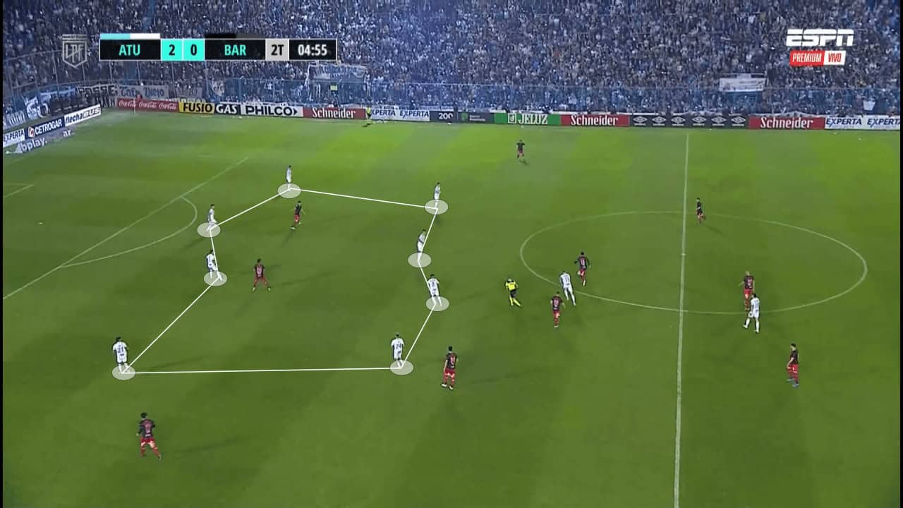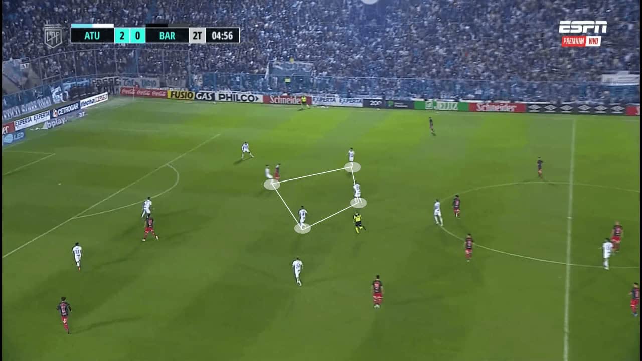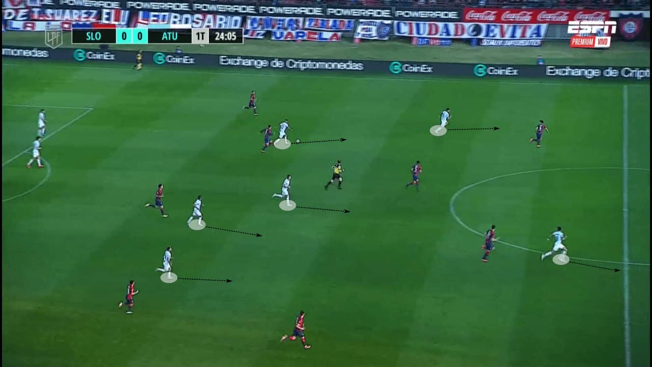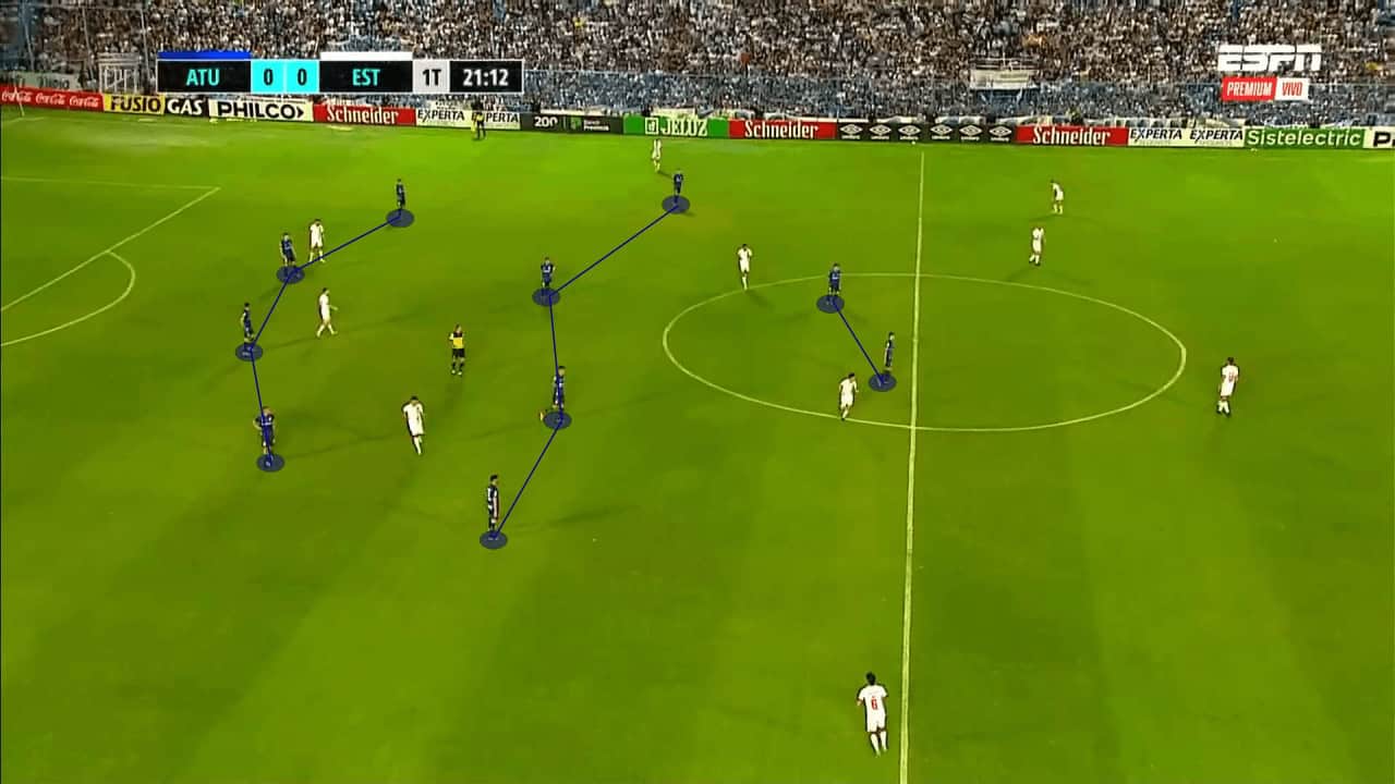 In the example below, as San Lorenzo try to create through the left wing, Tucumán are able to create a 4v3 scenario and regain possession. With the nearest midfielder and centre-forward being able to provide support, they are easily able to overwhelm the wide areas and create favourable scenarios.