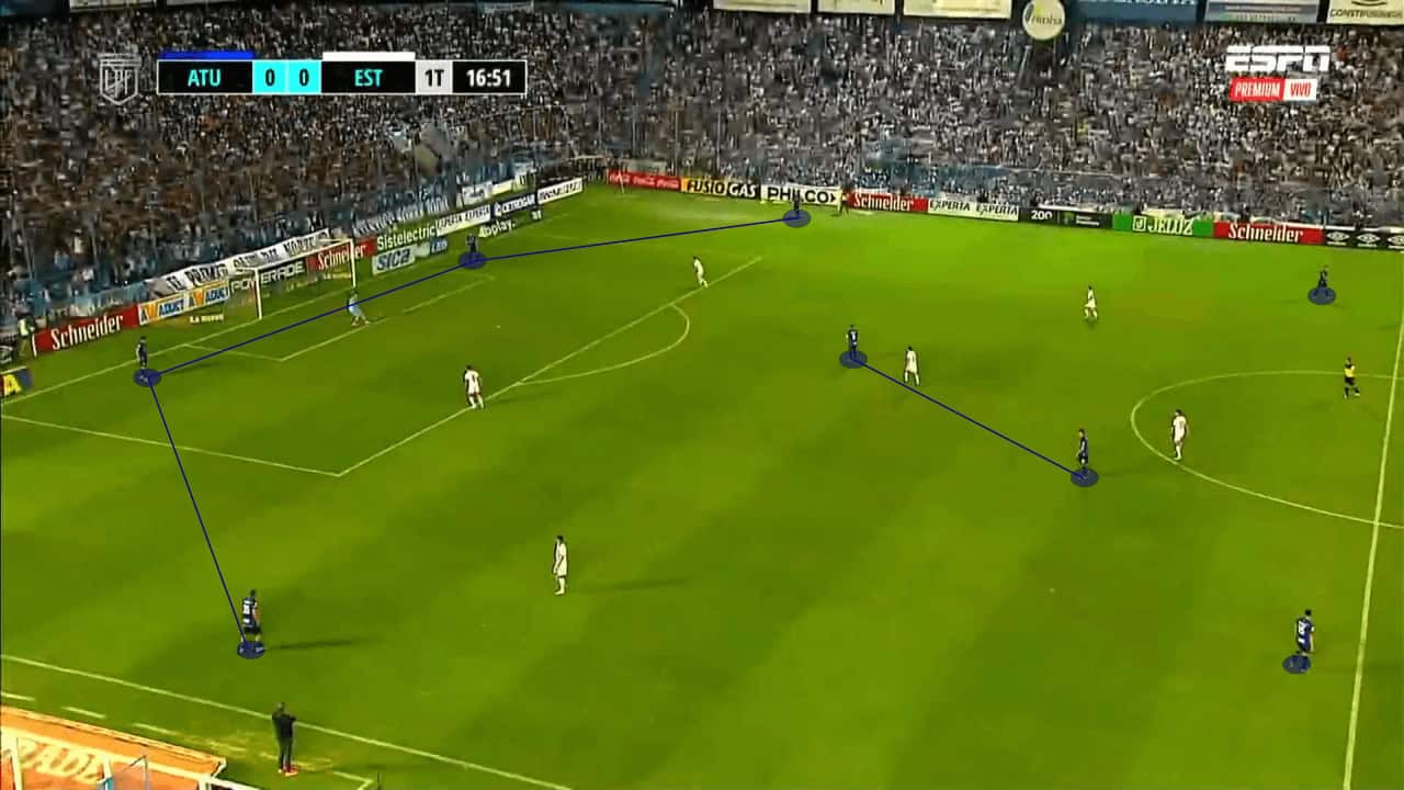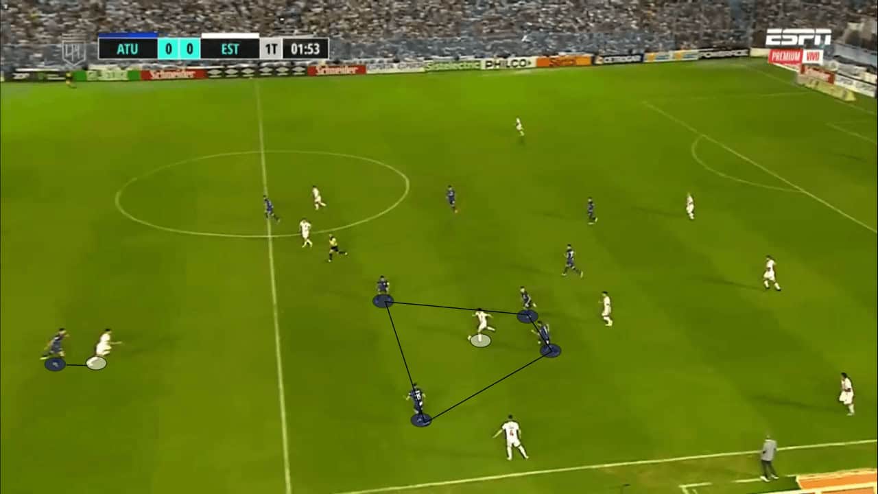 This compactness takes us to the next principle that allows for such an effective defensive system. Numerical superiority. With the ball as a reference point, Tucumán aim to constantly have numerical superiority in a specific area. With the 4-4-2 being such a balanced and dynamic structure, they are constantly able to do this with success, both wide and centrally.