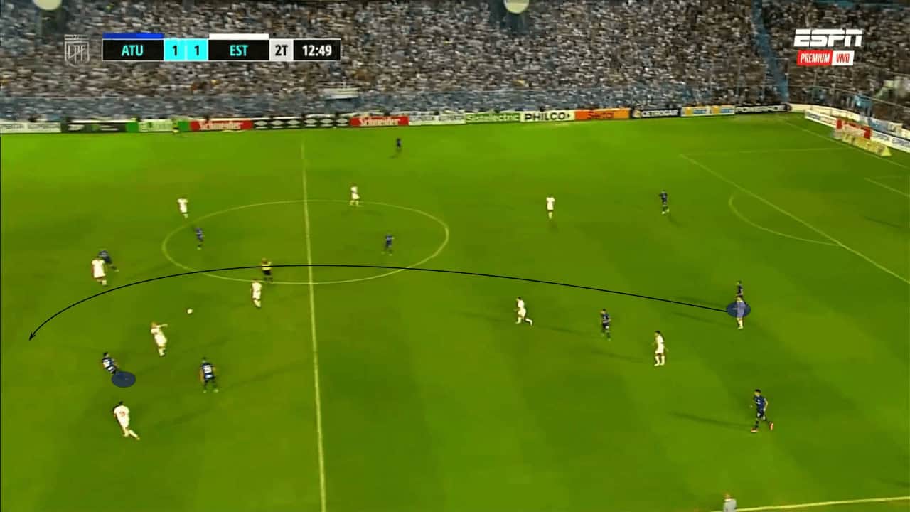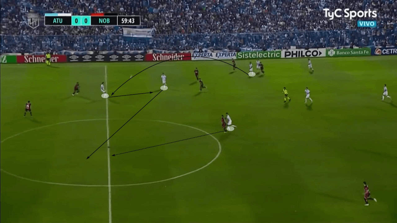 In another example, we are able to see how they launch quick transitions through intelligent combinations. After recovering the ball, Tucumán’s player plays it long to the centre-forward who lays off the right winger. After receiving it, the winger plays a through pass for a central midfielder coming from deep. These sorts of coordinated movements and combinations are what make Tucumán so lethal in transitions.