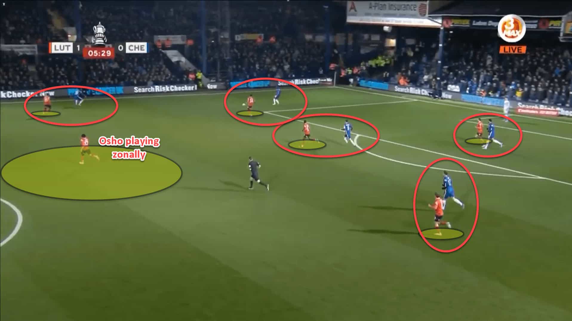 This man-oriented-zonal mix allows Luton to be very intense in their high pressure but also gives them security with Osho, or whoever plays there, sitting deeper to clean up any danger in case the press is broken.