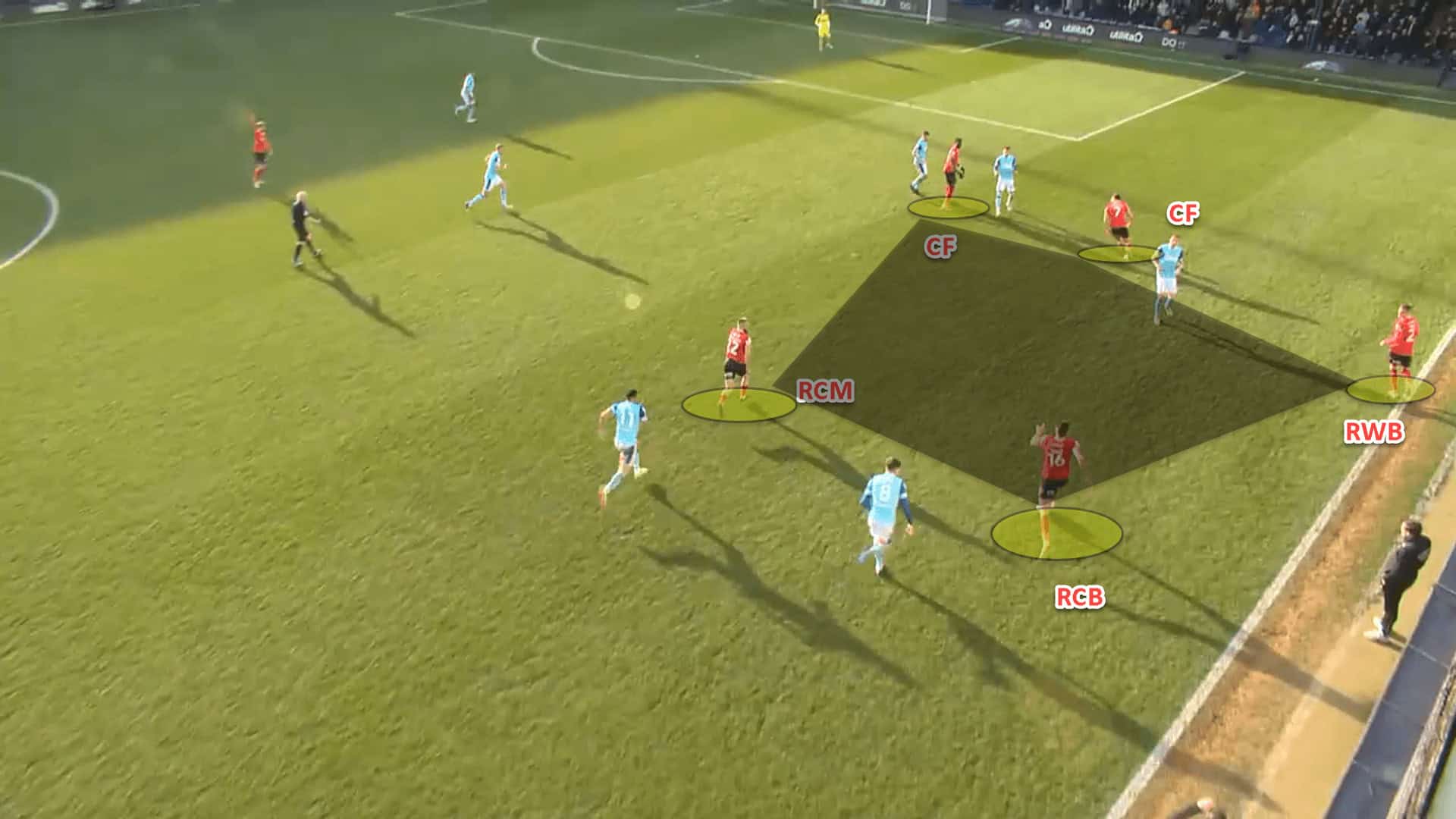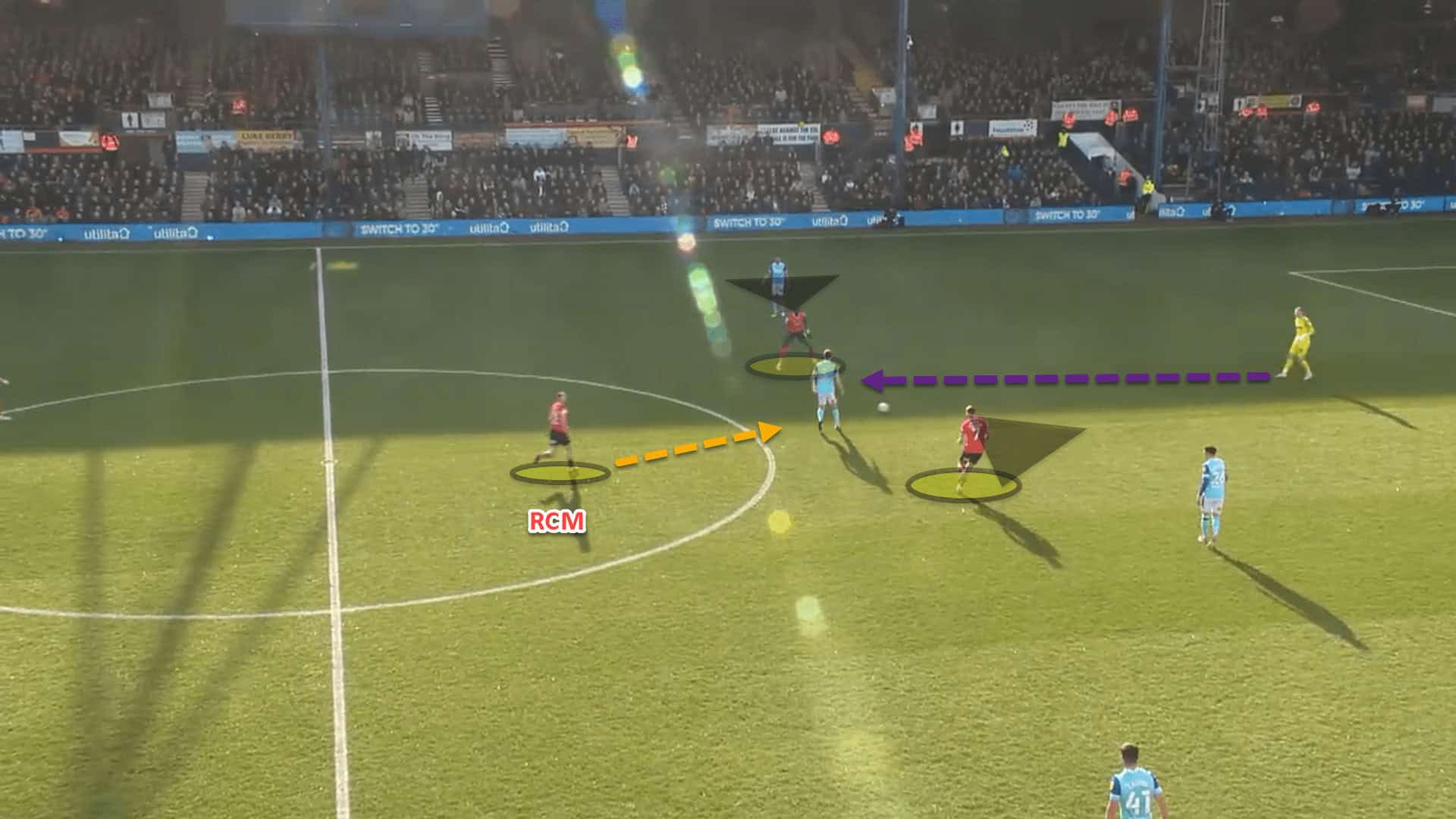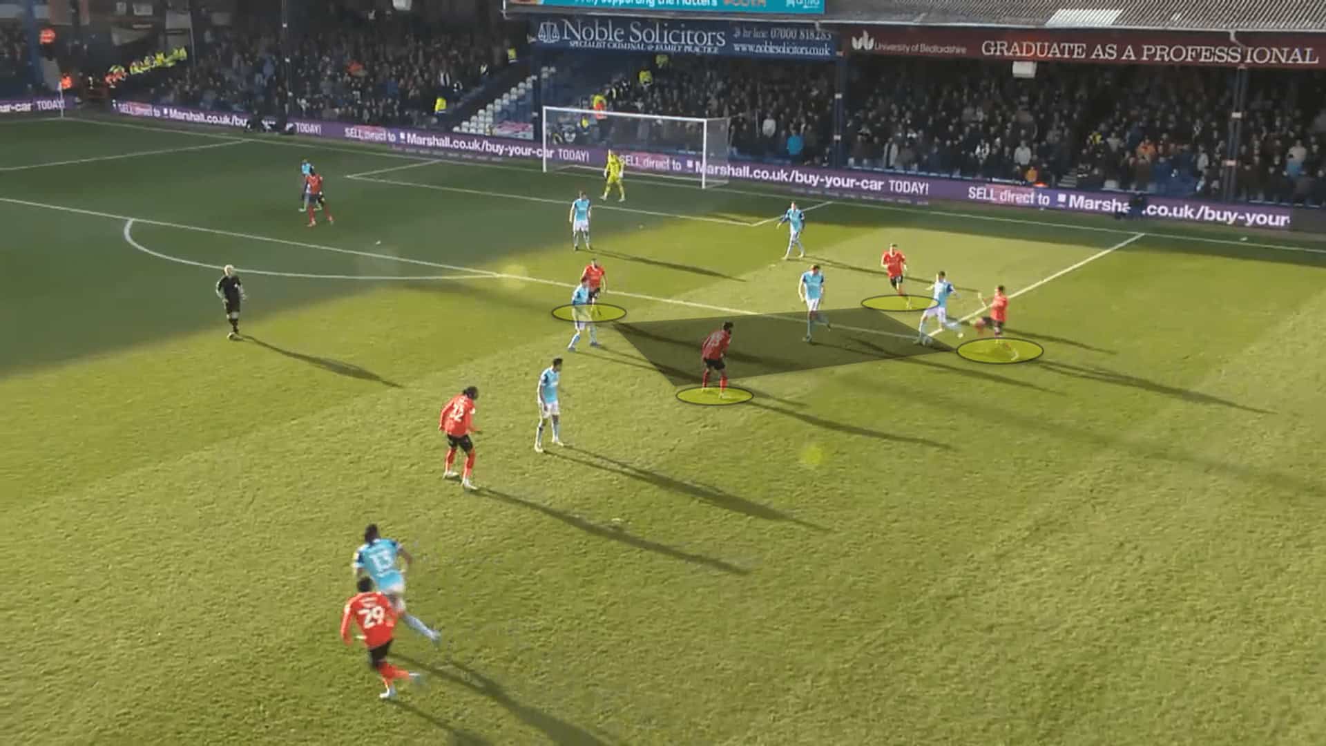 Another key component to Luton’s tactical system under Jones is luring the opposition into pressing traps in the central areas. These traps occur when the side are pressing high but also when sitting in a mid-block.