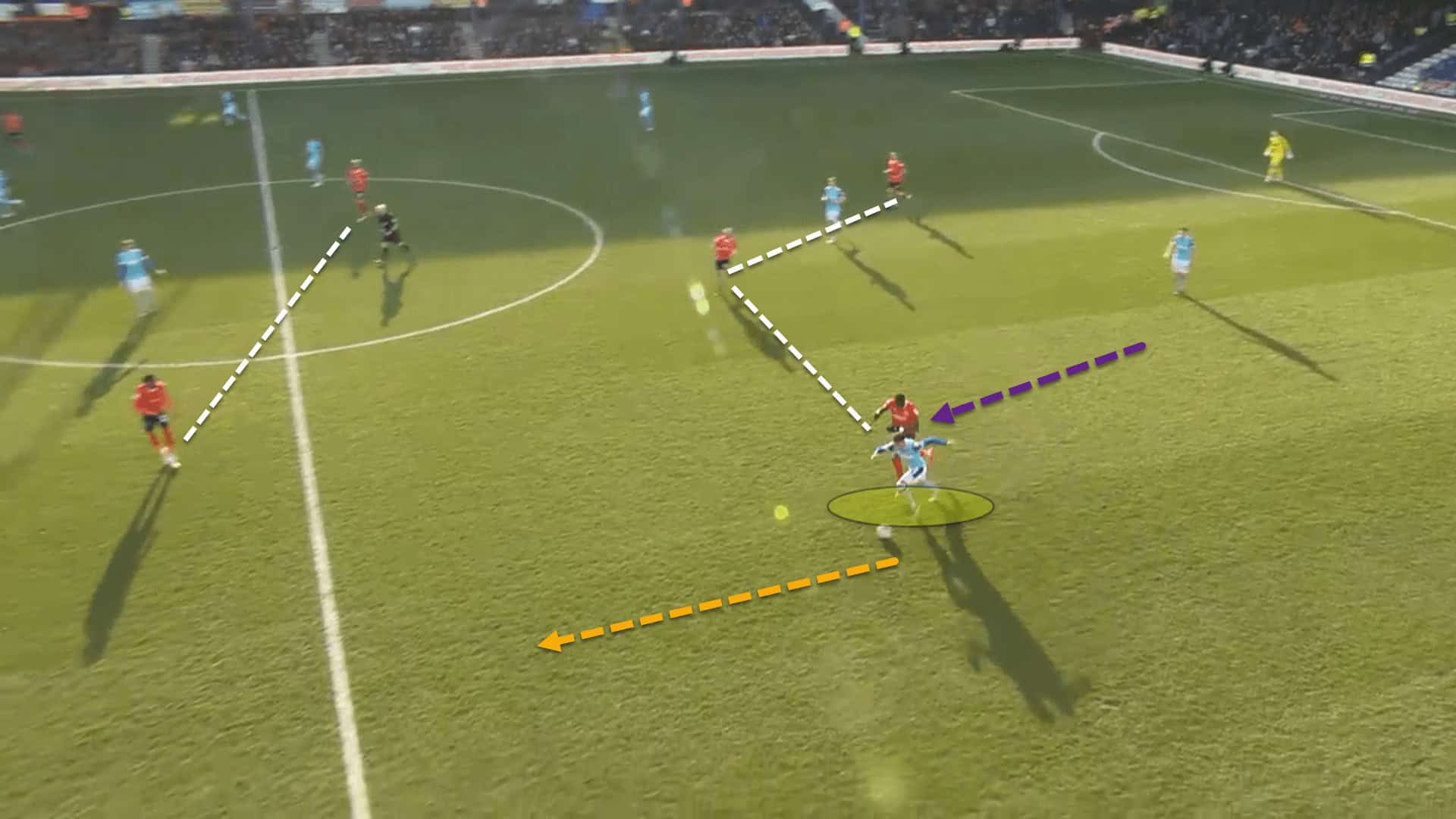 Derby’s pivot midfielder was forced to either play a negative pass back to the goalkeeper, allowing Luton to push their defensive block higher while chasing the pass, or else turn and try to play past the onrushing presser, risking losing possession in a dangerous area. The first option was taken.