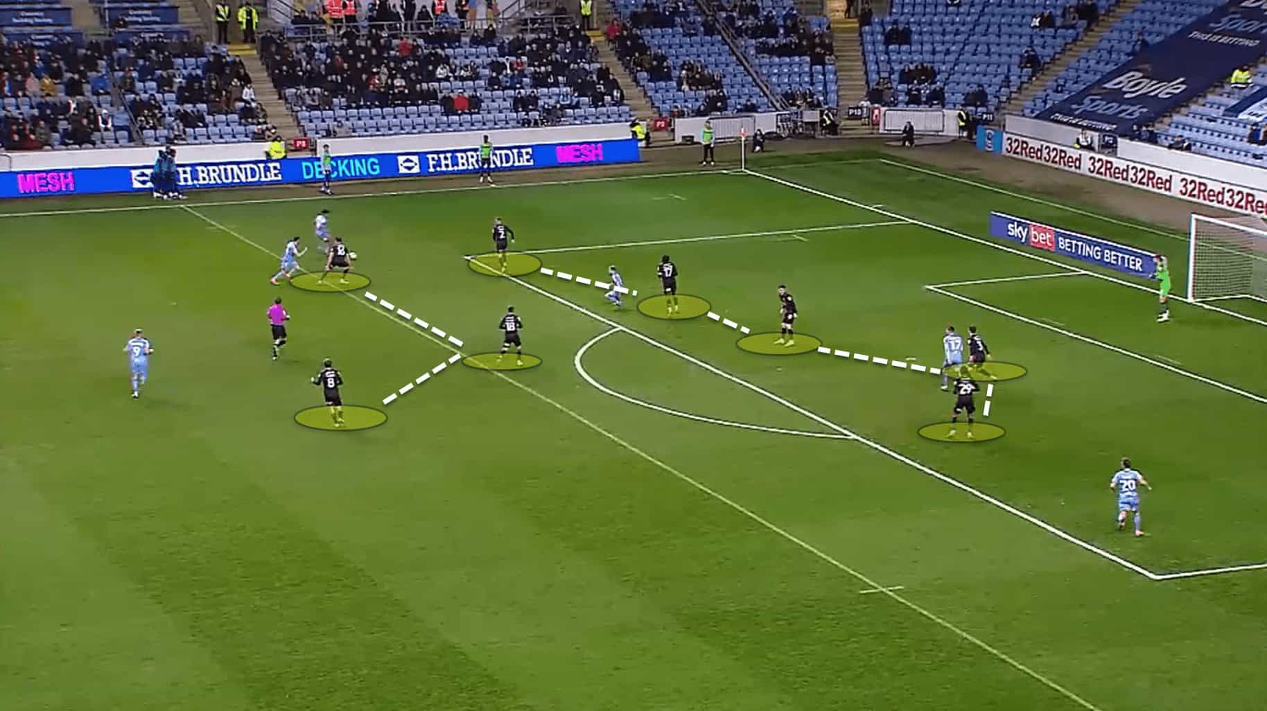 But what tactics does Jones deploy in the high-pressing phase to optimise Luton’s ability to do so? The answer is a mix of a man-to-man and zonal pressing system. Luton’s 3-5-2 turns into a 3-2-1-4 during this phase as the wingbacks push up to mark their opposite numbers and one of the central midfielders move higher to sit on the opponent’s deepest pivot.