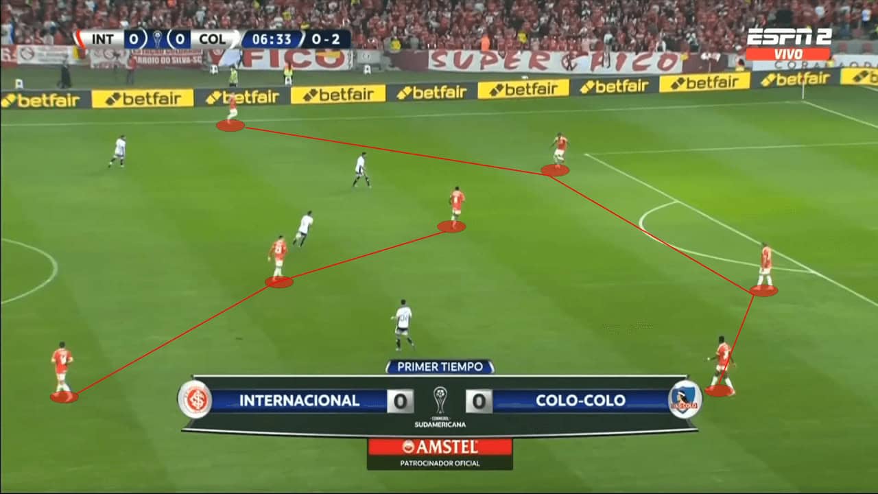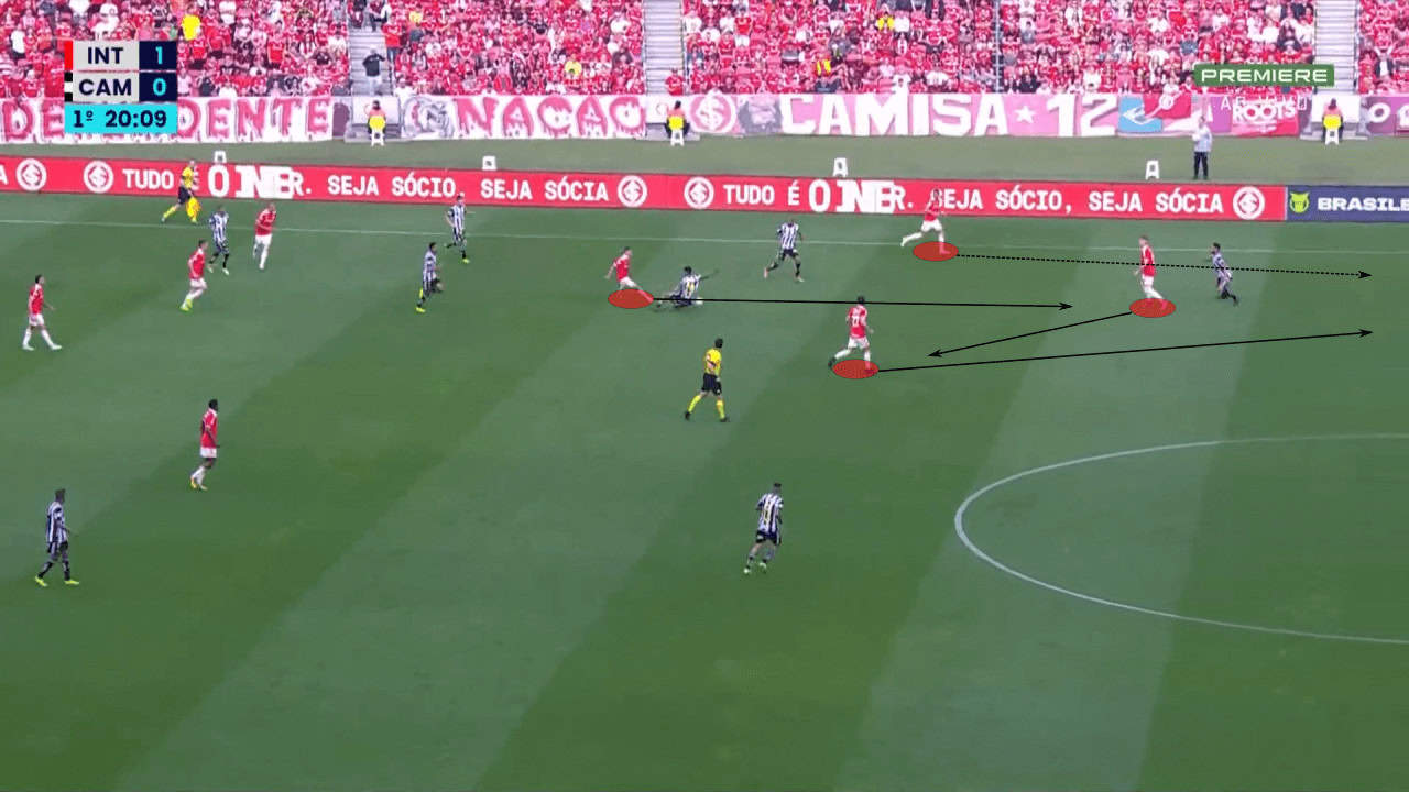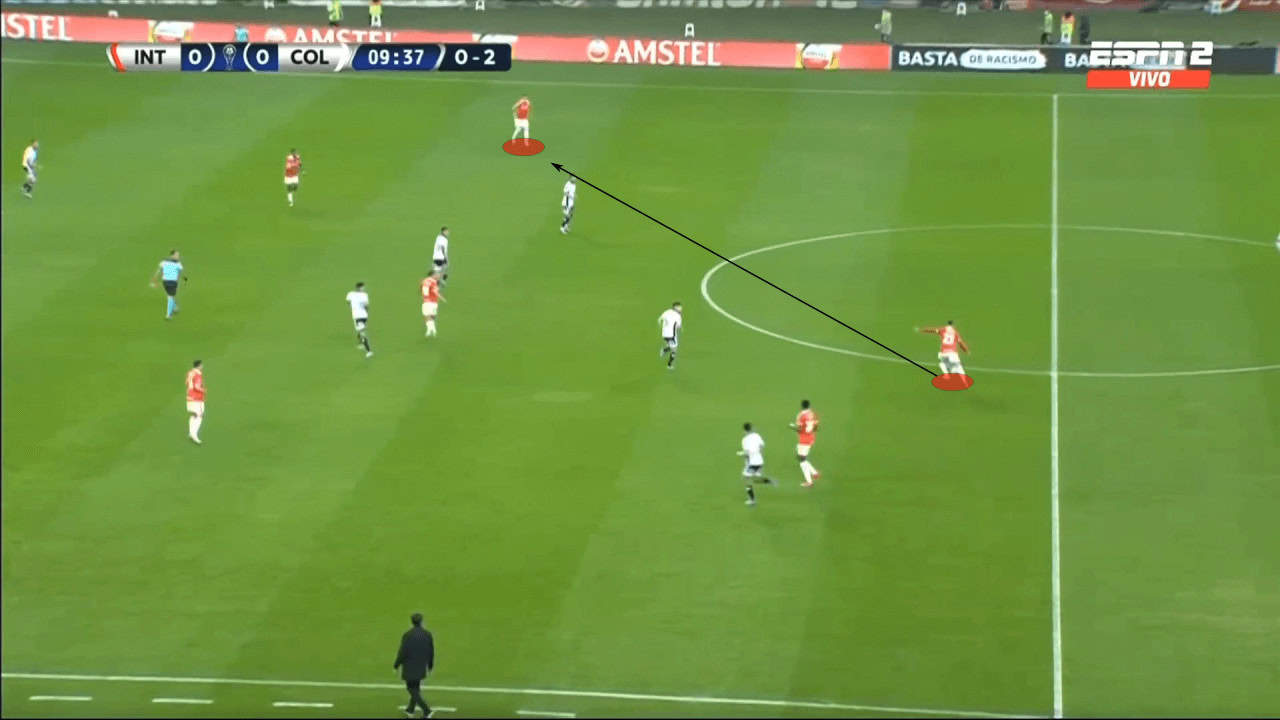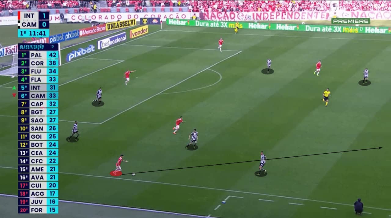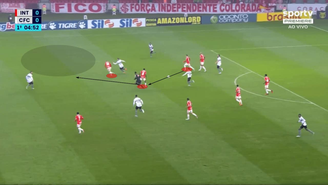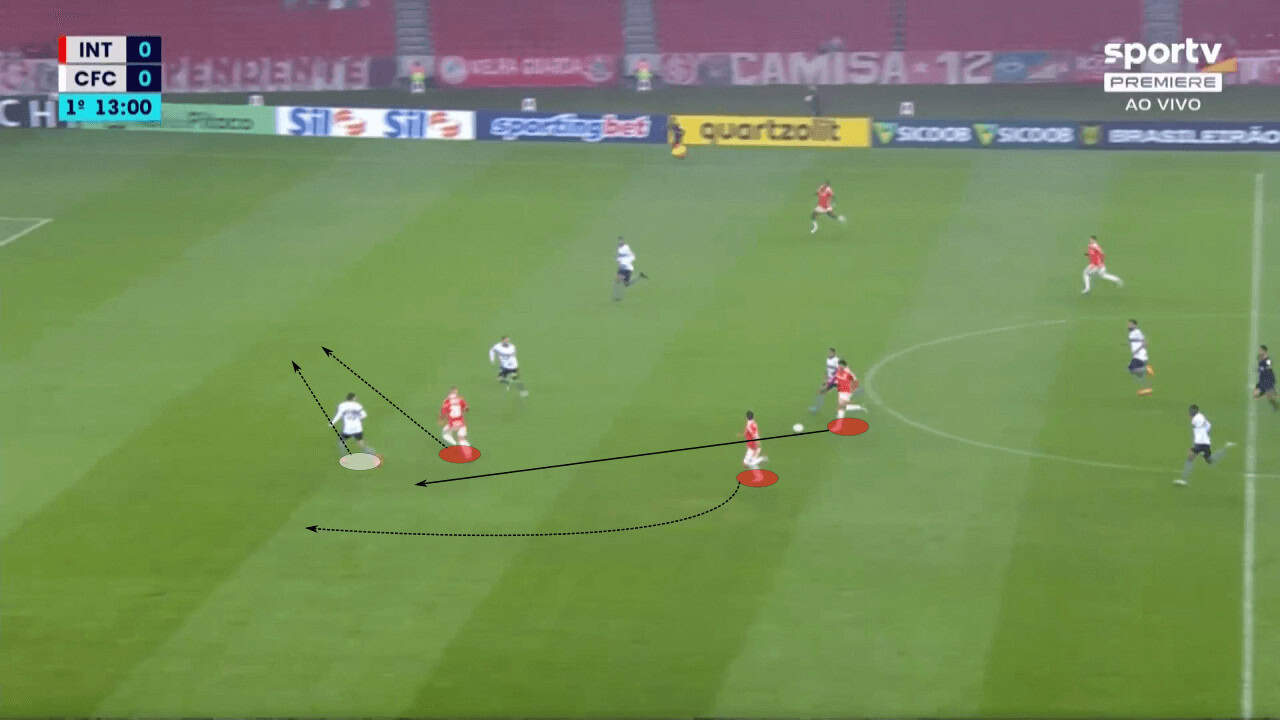 Internacional are very much a transition-based side. As just explored, in possession, Colorado attempt to create these scenarios and exploit a disorganised defensive structure. As expected, their work in the offensive transition phase of the game is incredibly dangerous.