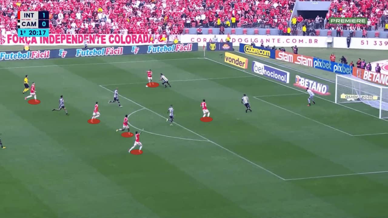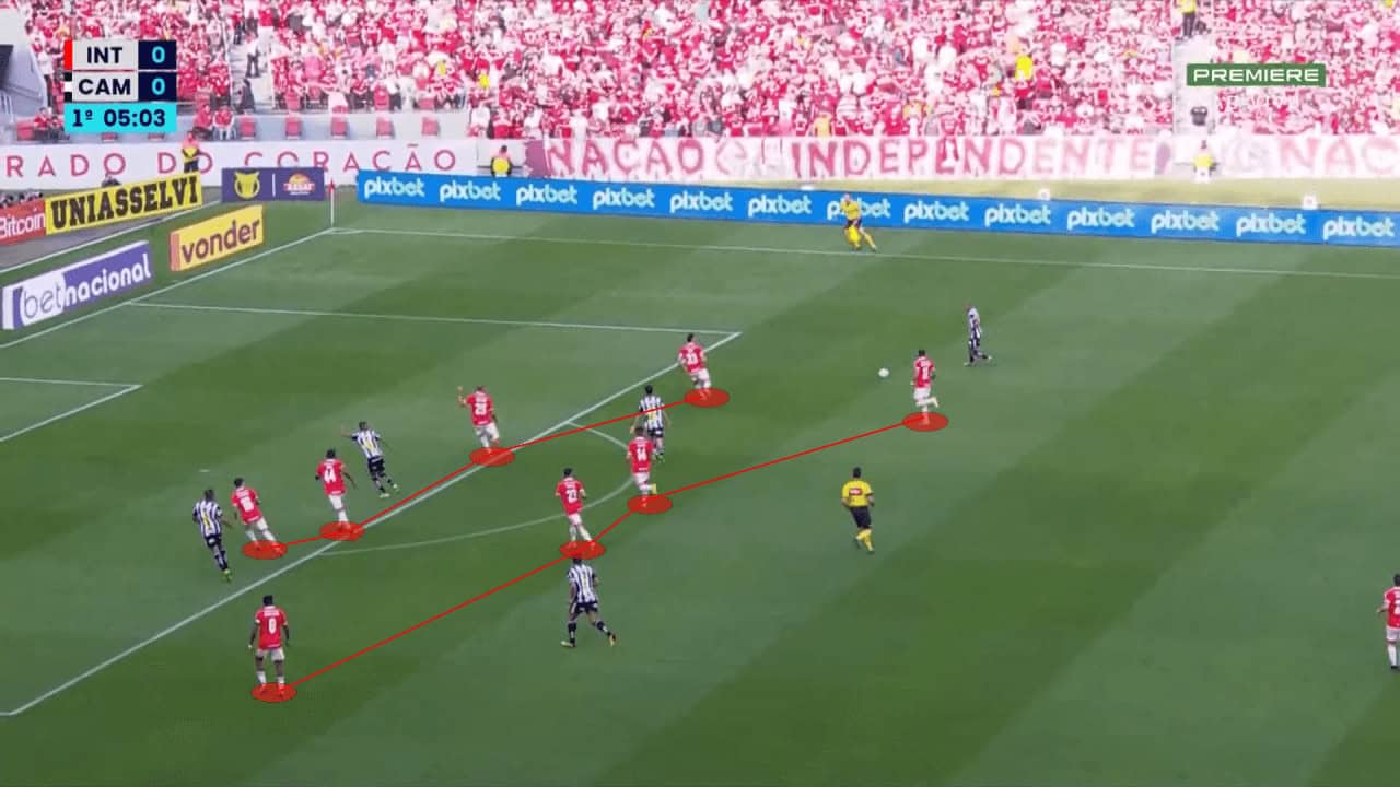 It is also impressive the numbers they use to counterattack. Mano’s men will collectively launch forward and overload the defence. In the example below, six Internacional players arrive in the final third compared to Atlético’s five.