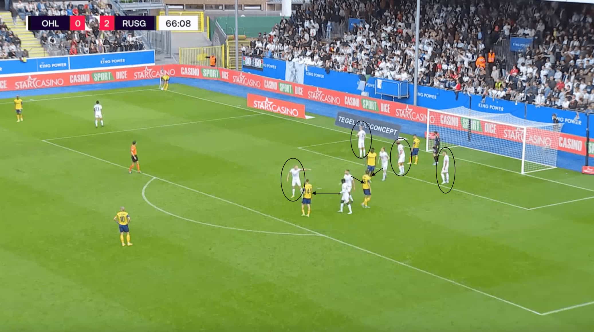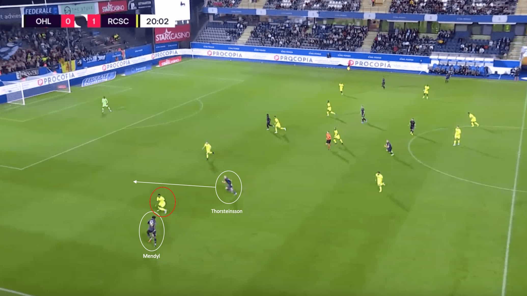 As mentioned earlier, the fullbacks look to join the attack to try and create 2v1 overloads in the wide areas with the wide attacking midfielders. The phase of play above shows a good example of this movement. On the near side, Hamza Mendyl has received possession in an advanced position on the left wing. This space was opened up by left attacking midfielder Jon Torsteinsson tucking inside. As a result, it creates an overload against the Charleroi defender, which allows the Iceland international to make a run behind the Charleroi defence.
