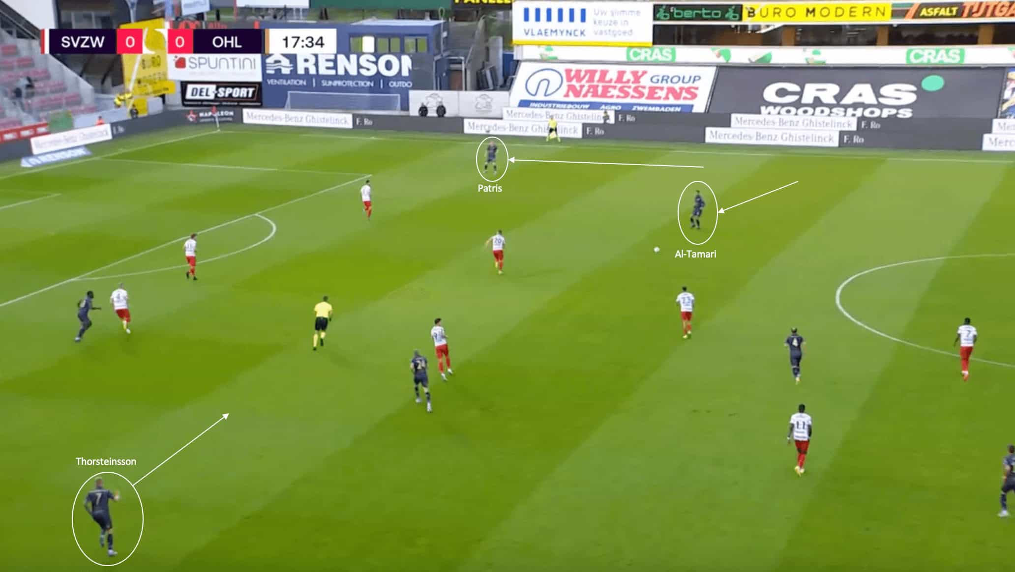 On the far side of the field, Thorsteinsson and Mendyl do the exact same thing. Although Mendyl is not in the picture, the movement of the Icelandic international to tuck inside allowed the fullback space out wide to move into. Al-Tamari’s ensuing pass is played out wide to Patris, who is allowed the space and time to send a cross into the box. The ensuing cross is cleared away by the opposition defence, but once again, the ability for Leuven to create space out wide allowed for a chance to score.