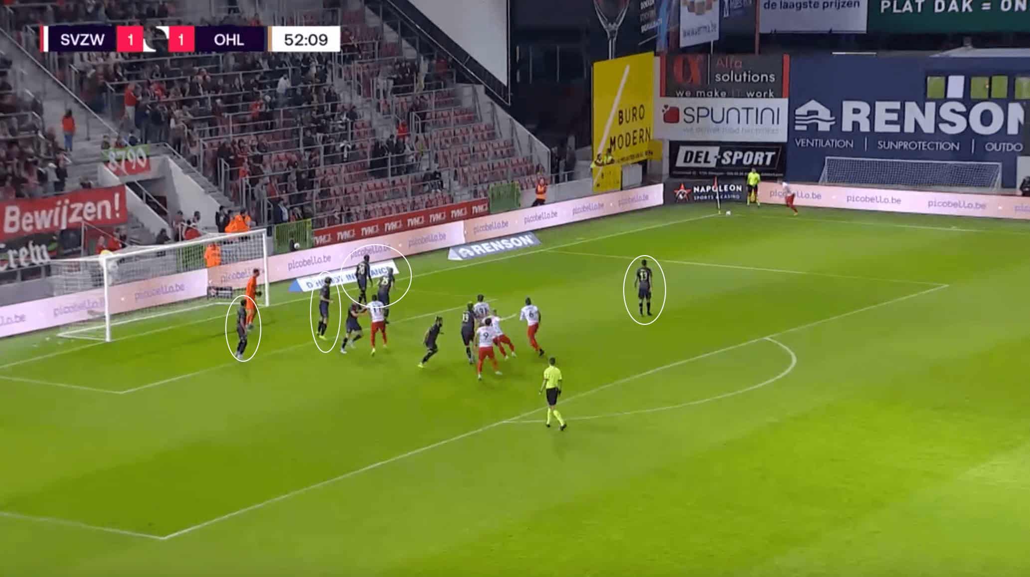 Though OH Leuven have the joint most goals conceded in the top eight of the Belgian Pro League with 18, the vast majority of these have come from open play. In regards to defensive set pieces, they have only conceded 3 from these phases of play, one of the best tallies in the league. This section will take a more detailed look at their defensive set piece set-up, and analyze why Marc Brys’ side have been one of the best at defending them this season.