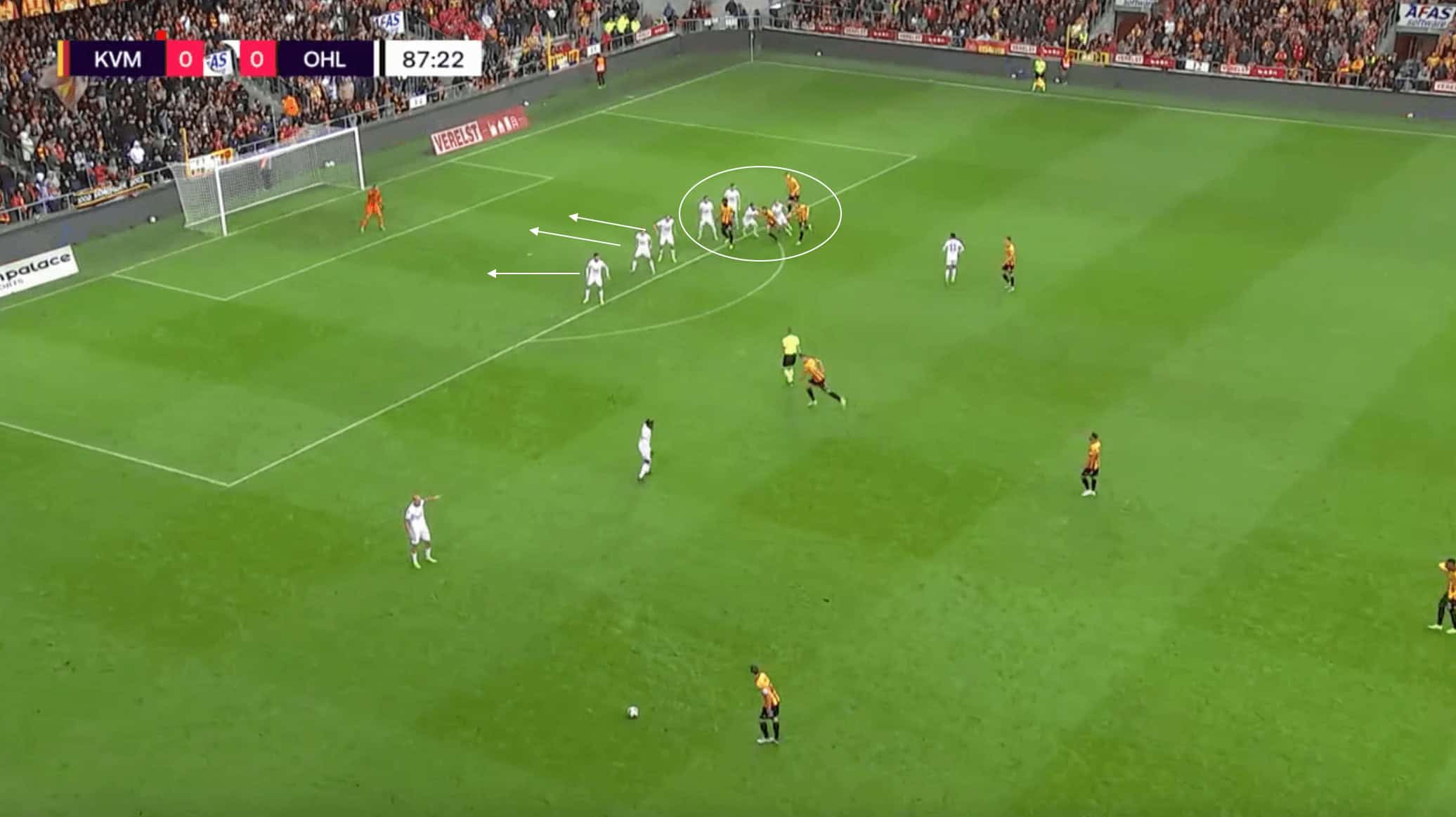 Also, notice how the same type of overload situation is presenting itself on the far side, with right-attacking midfielder Mousa Al-Tamari and right-back Louis Patris being in similar positions, attempting to isolate the defender. A lot of these number-up situations in the attacking half can be attributed to how many Leuven players join the attacks, with eight of the ten outfield players positioned in the attacking half of the pitch during this offensive phase.