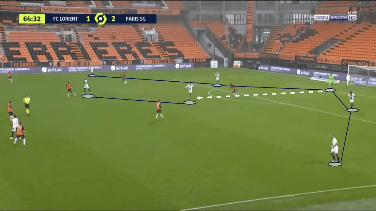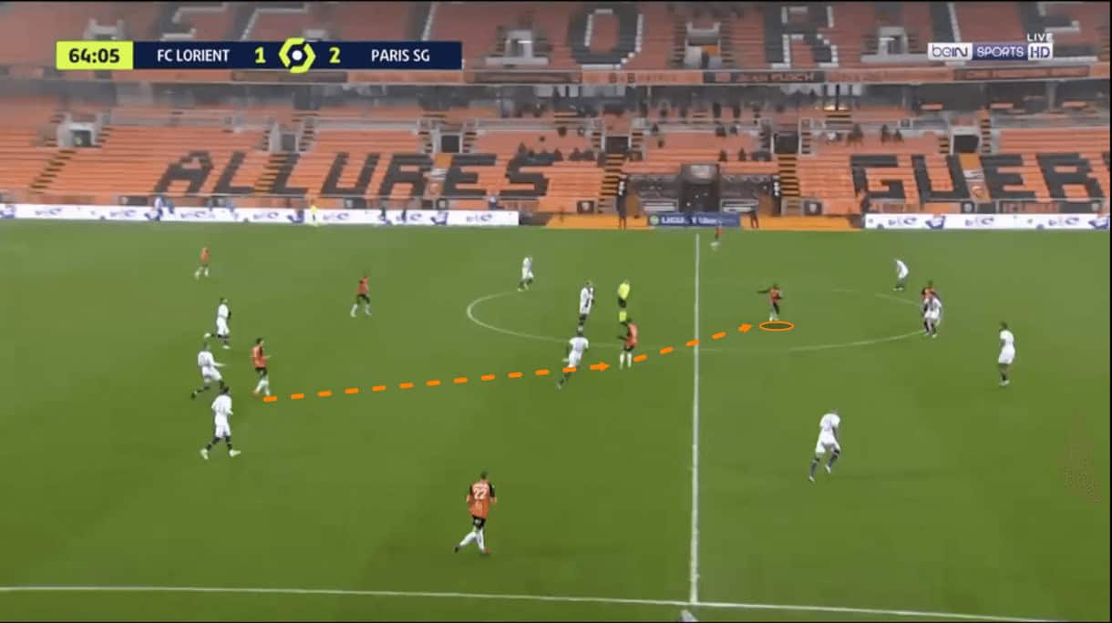 The image above shows us an example of this, with Paredes dropping deep, in between the centre-backs but, conveniently, behind Lorient centre-forward Terem Moffi.