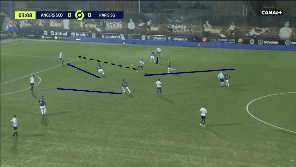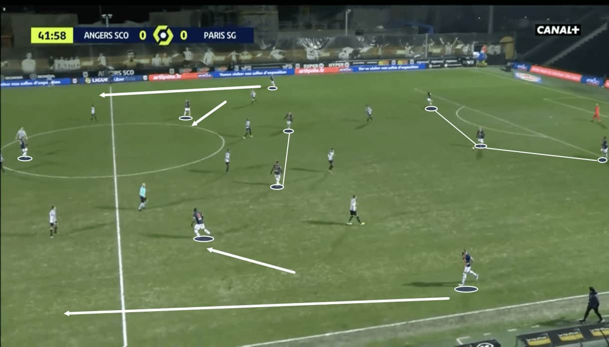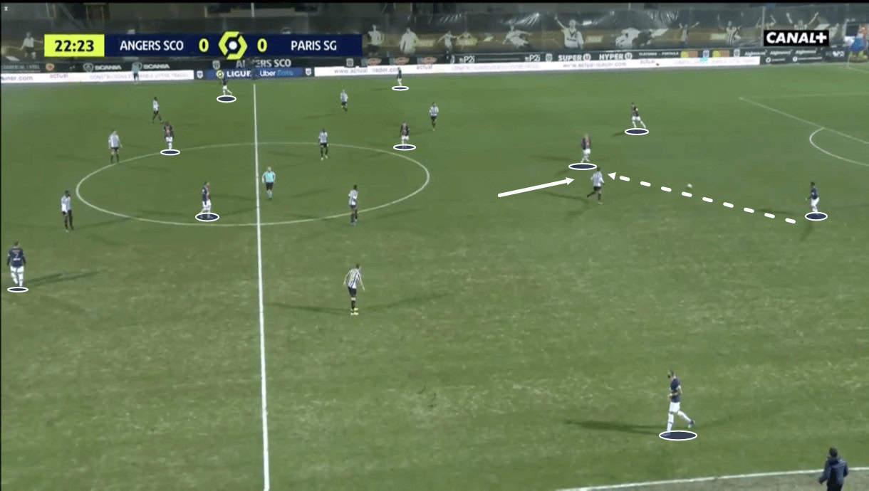 We can see in this image above from the Angers game that when Paredes receives the ball here, he has a plethora of potential passing options available to him, which Pochettino will undoubtedly have planned.