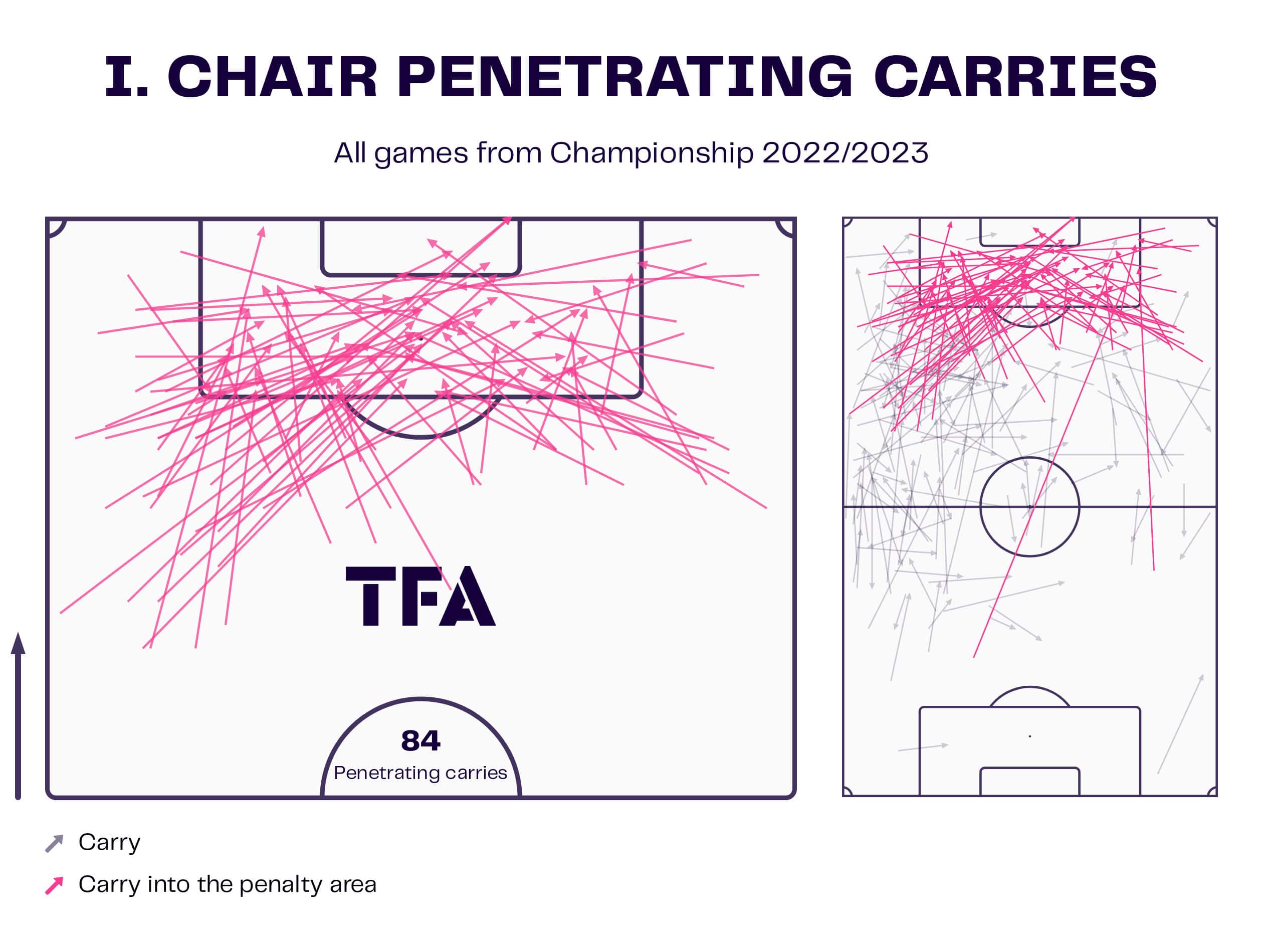 One main threat in QPR’s attack is talisman Ilias Chair. Chair prefers to play as a ’10’ which is suited to Beale’s 4-3-1-2 formation but is also comfortable playing on the wing. His attacking and dribbling ability is exceptional and key to QPR’s success. The Moroccan star has 3 goals and 6 assists already this season and is attracting a lot of Premier League interest. Below are his penetrating carries in the EFL Championship 2022/23 season.