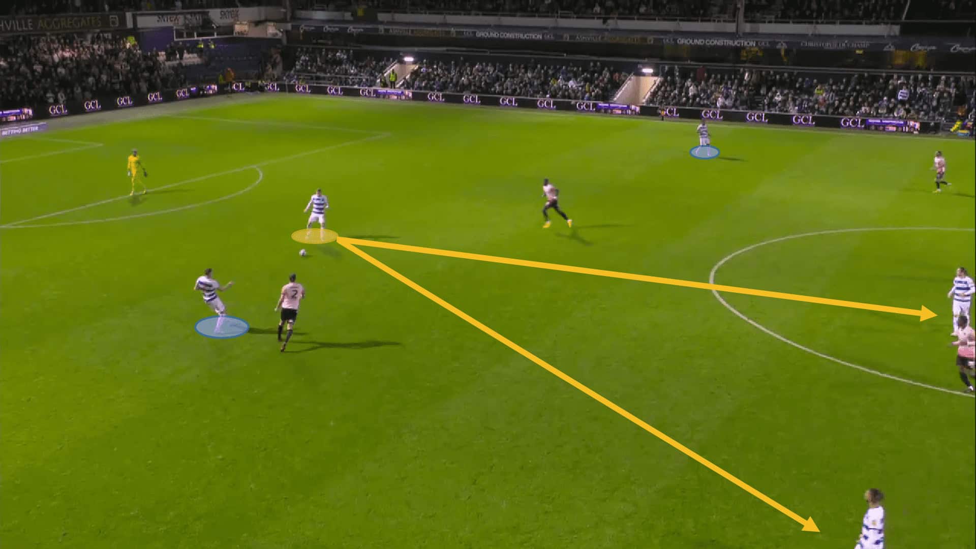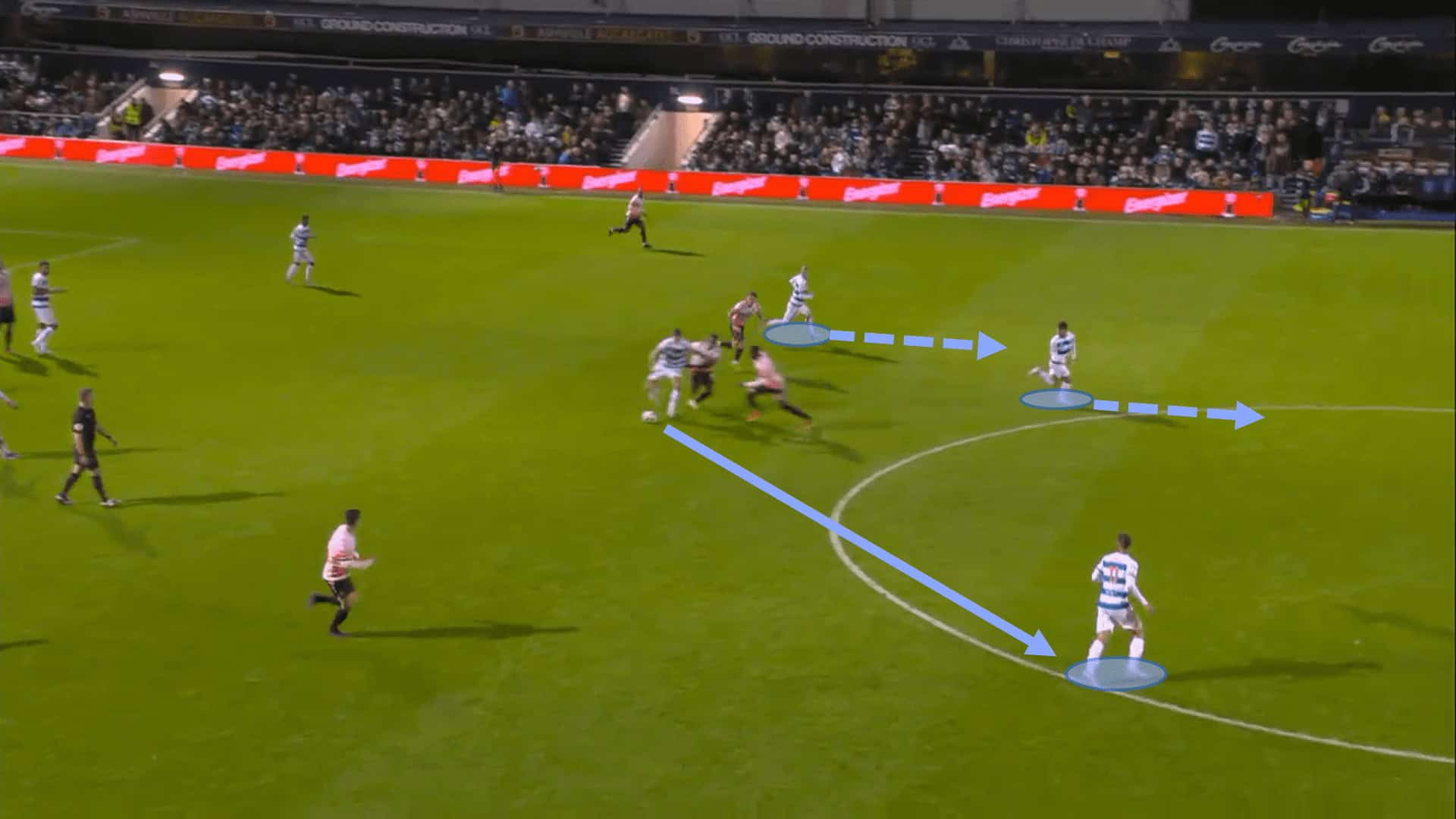 Once the R’s have regained possession, they are quick to break forward. Like their attacking style of player, they look to break into the attacking third with direct dribbling and quick progressive runs. The image below shows how QPR assert their possession and immediately have two runners in behind.
