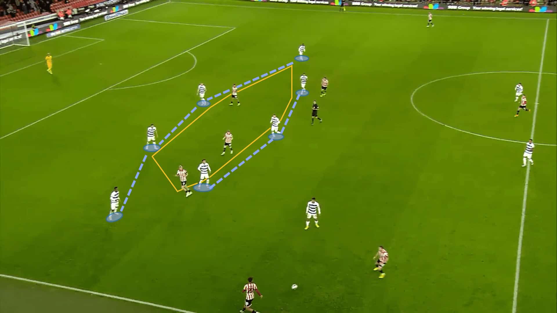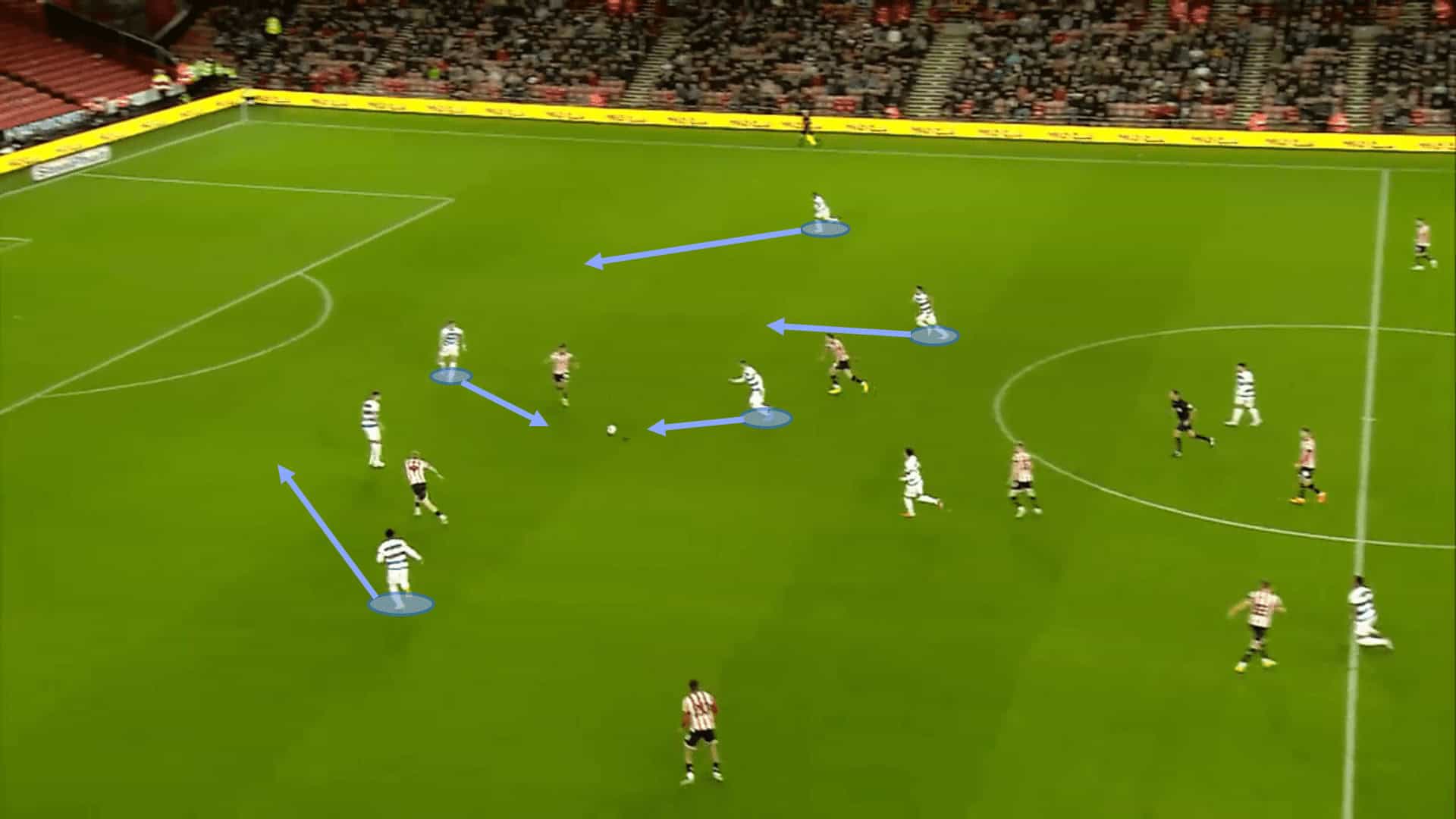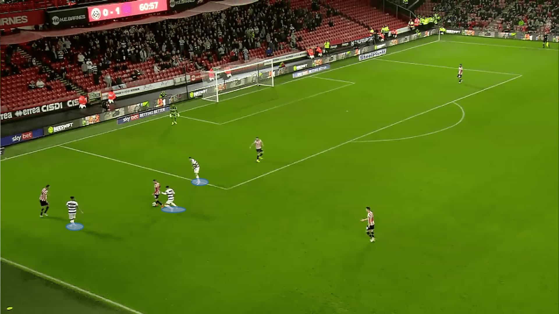 The image above shows how this setup works in real-time. The advancing player takes the ball into the box where he has three options to pass the ball to. With a four versus three situation, the chances of a first contact drastically increase. QPR’s overload in the box does see them score a lot of first-time finishes inside the penalty area. The man looking to cross the ball has a choice of a low-drilled cross, a lifted cross or even a cutback. All attacking players ensure that all of these options are always viable, making QPR a real threat in the final third.