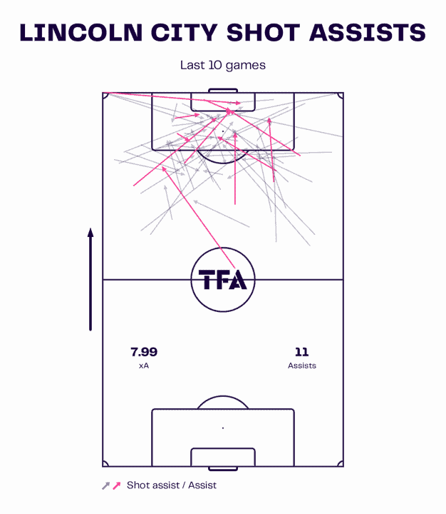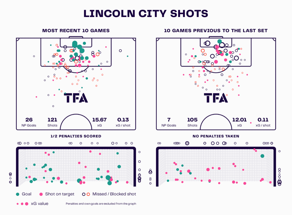 26 non-penalty goals in their last 10 League One fixtures is almost four times better than their record in the 10 games prior to that, despite an xG jump of just 3.66, suggesting that Lincoln are simply being more clinical in attack.