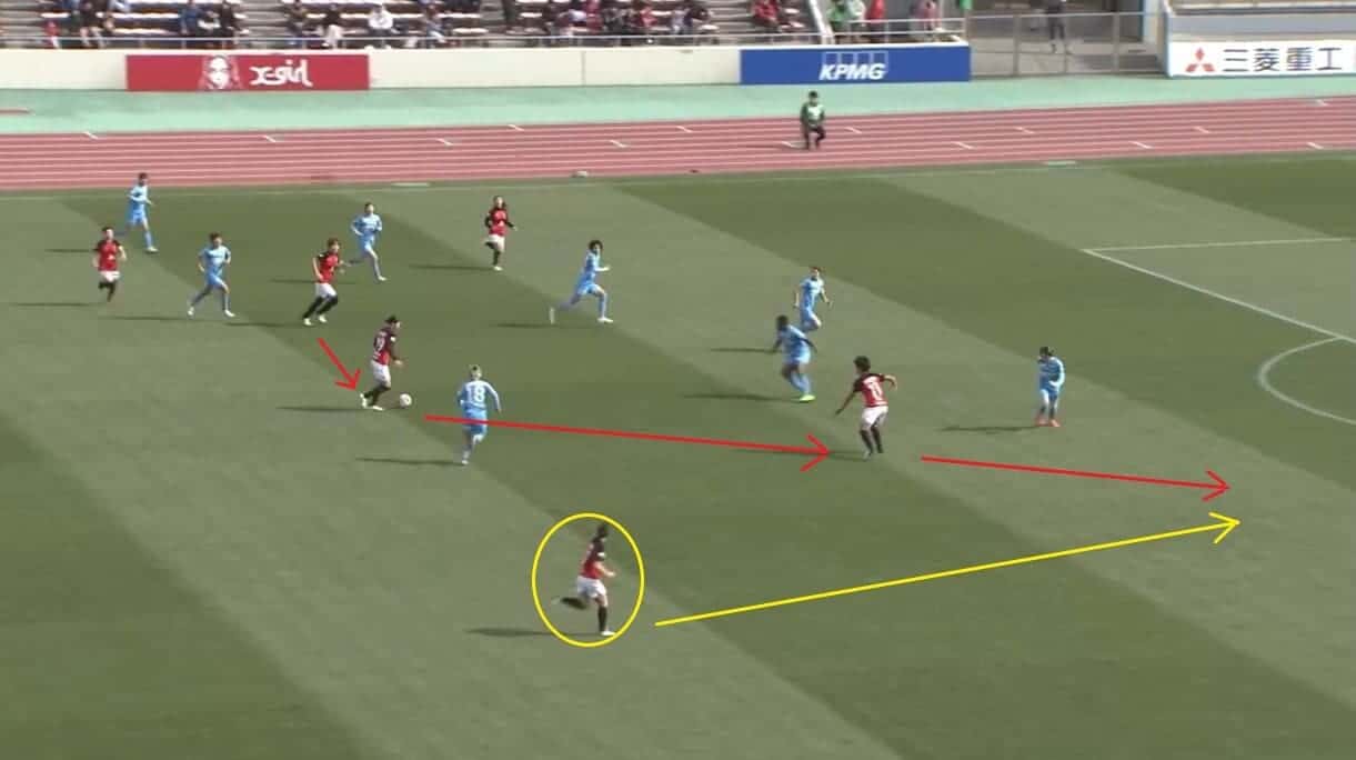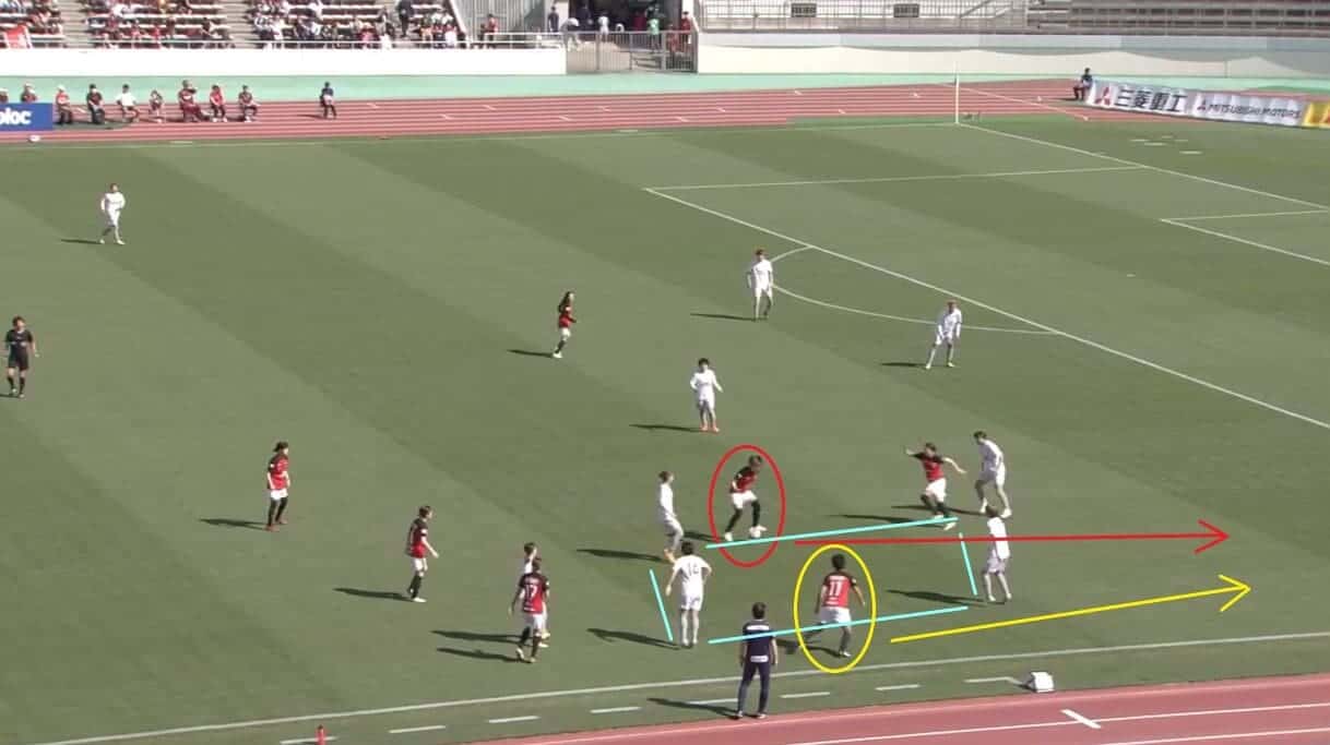 Once again, this involves the whole team working together, and that starts from the back for Kusunose’s side. Their desire to play out from the back is a key aspect of their build-up play, and the defensive line is tasked with moving the ball into areas from which it can then be sent into dangerous positions.