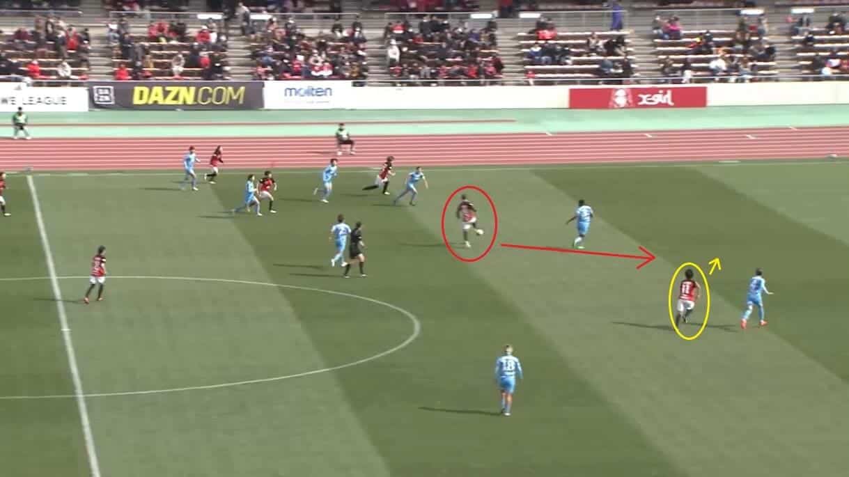For some players, this ability to drift between roles is a quality that needs to be developed, but for others, it comes more naturally, and one who has always thrived at it is the aforementioned Shiokoshi. Mainly operating in the advanced midfield role, she has largely been Urawa’s creator-in-chief when the ball does access spaces higher up the field, as was clear to see in the last example when she made the final pass that set up the goalscoring opportunity.
