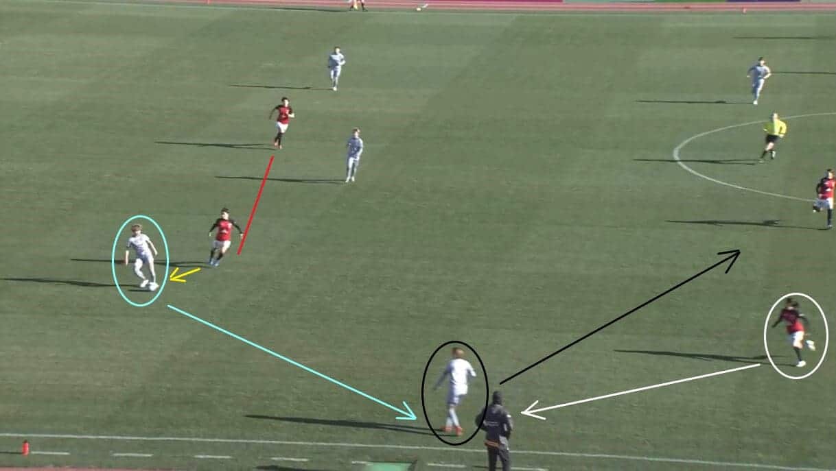 Up until this point, she has only done what most others in her position would have done, but where things become interesting is that Endo then doesn’t move back out towards the wing and instead continues to advance in the same inverted manner. As a result, she has gone from being a right-sided defender to a central playmaker in an instant, and that is where the positional flexibility is shown clearly.