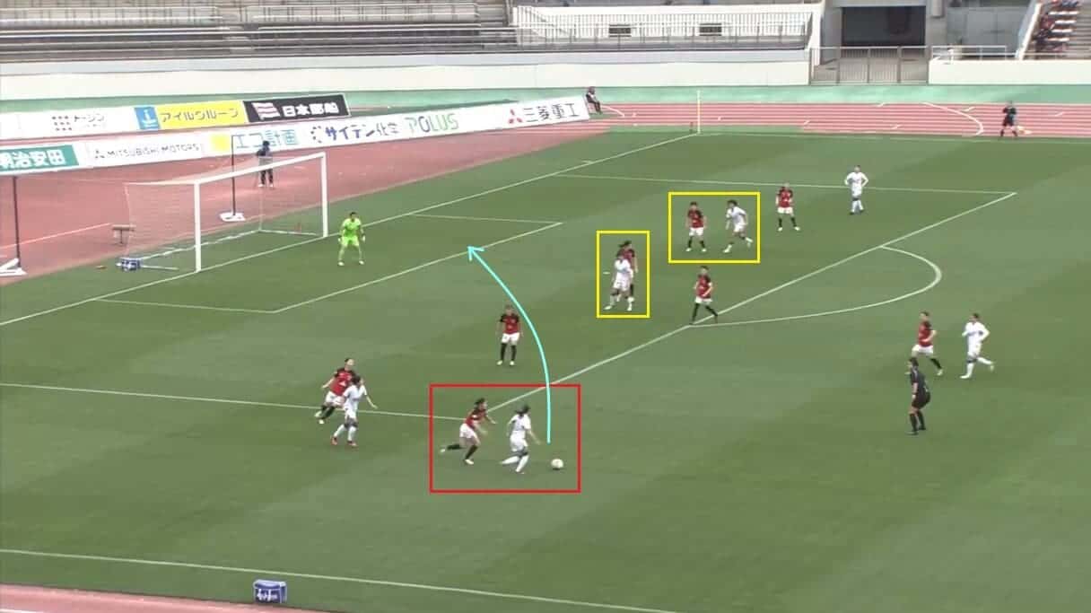 However, the fact that Shimada, like every Uwara player, is really good with her feet and decisive when she is in control of the ball means that she doesn’t lose her composure and instead simply takes one touch to stop the ball and another to send it forward, with Seike making a run into the space that Osaka have left unguarded behind them and giving her team a way of turning what looked like a potentially tricky situation into one that could prove to be advantageous for them.