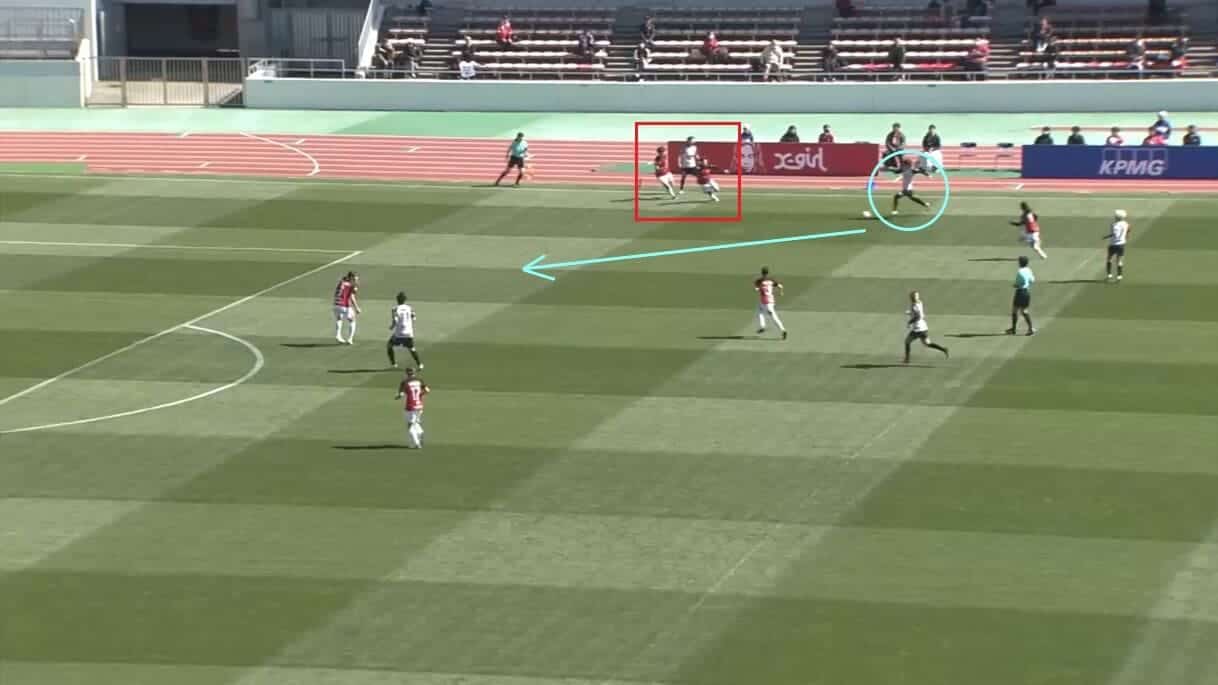 What is important to note, though, is that both players don’t move forward at the same time, with the risk of doing so being that the two centre-backs are left too exposed should possession be lost. As a result, one moves forward, and the other stays back, which then allows Urawa to both support attacks but also leave themselves with enough protection behind to stave off the threat of counterattacks. In this case, it is Endo who has made the move forward, with her recognising the long clearance up the field made by Cerezo Osaka Yanmar Ladies defender Riko Tsutsui and moving to intercept the ball before it can be met by any of the opposing team’s players.