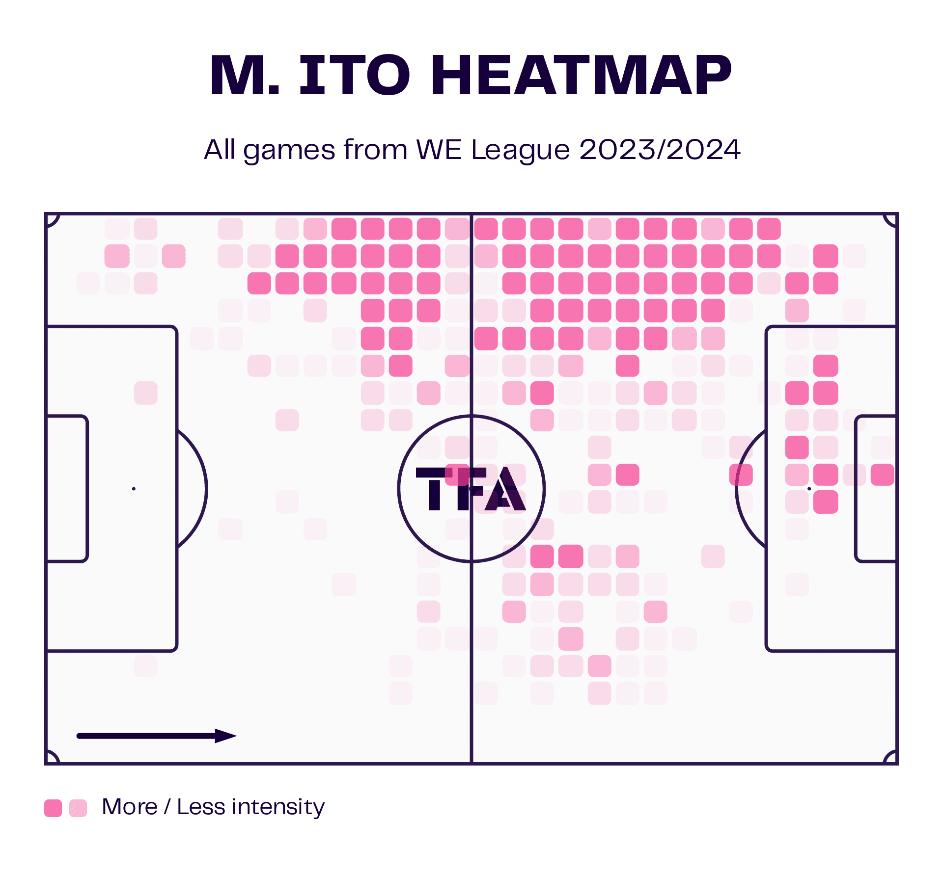 Her heatmap provides a clear indication of the variety of options that she brings to the table, with her mainly staying wide but also capable of drifting infield and of frequenting the central areas too, and she has been seen shooting at goal from inside the goal area and from other spaces further out. However, when the likes of Hikaru Naomoto have been in the starting XI, she has needed to adapt and to focus on playing a supporting role, with her role then being to stretch the opponents out horizontally and to ensure that key attacking threats in the middle have an abundance of time and space in which to operate at their best.