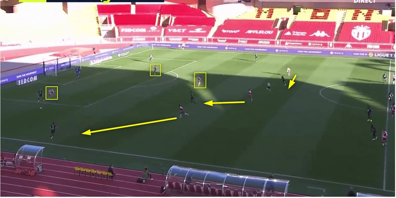 Monaco still played with vertical progression, but they looked to play through each third of the pitch more, aiming to create numerical superiority in each phase.