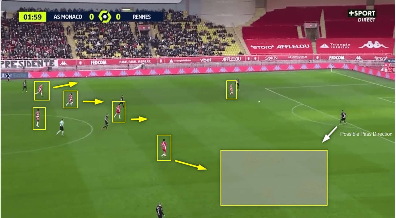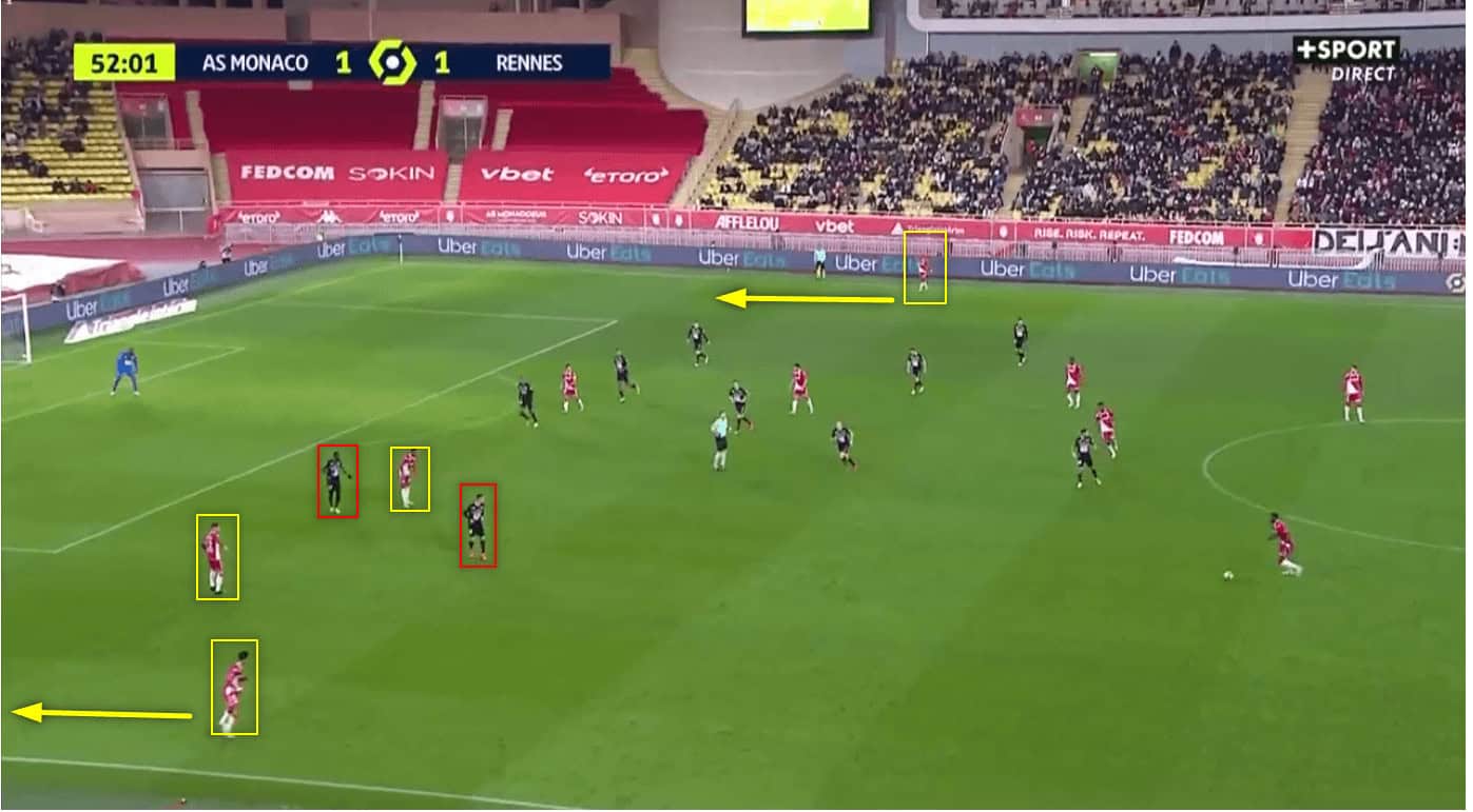 His position in the half-space creates the 3v2 and attracts Rennes to move over to that side as Monaco plays down the left flank.