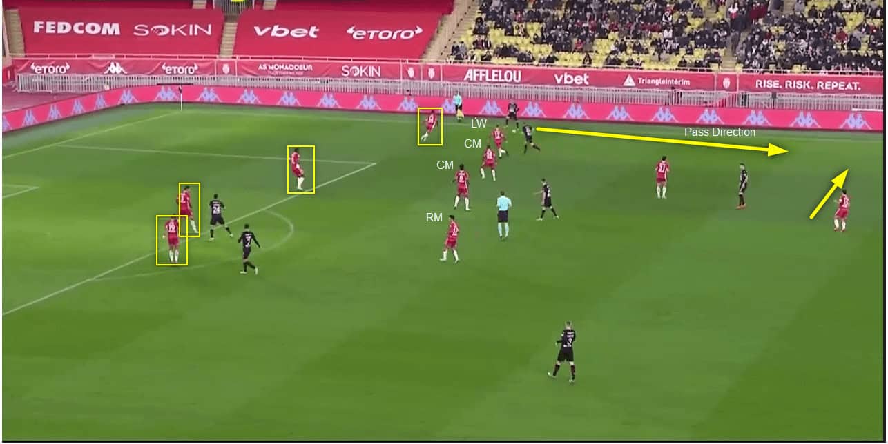 Building with either of these two shapes allowed Monaco to achieve a 3v2 numerical superiority against the opposition’s first line of pressure during the build-up.