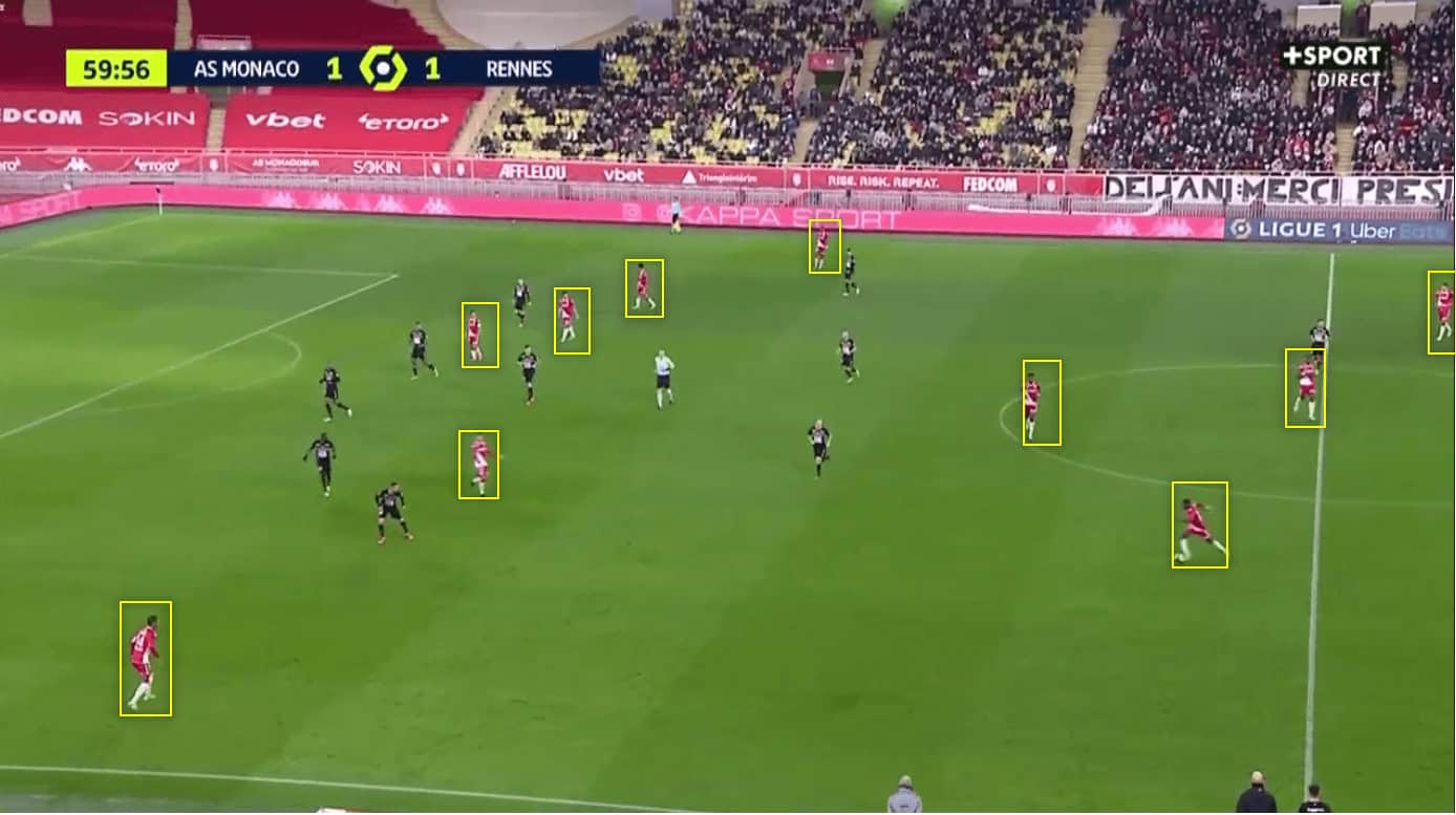 The image below shows how Monaco has two sets of two players between both the Rennes attack and midfield and the midfield and defence.